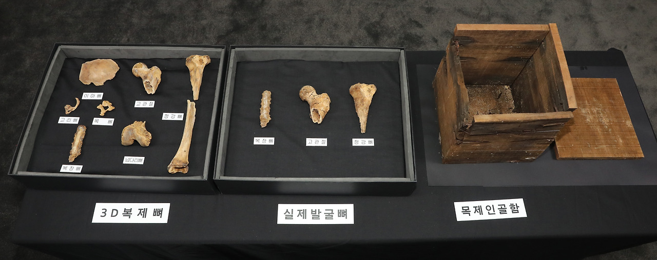 지난해 공개된 익산 쌍릉 대왕묘 출토 인골과 나무상자. 문화재청 제공