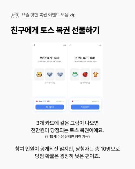 3개 카드에 같은 그림이 나오면 천만원이 당첨되는 토스 복권이에요. (만19세 이상 유저만 참여 가능)