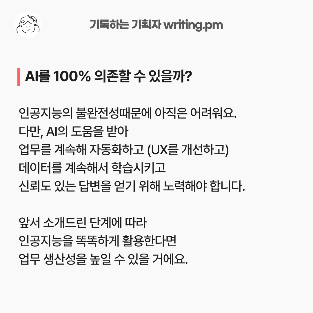 앞서 소개드린 단계에 따라 인공지능을 똑똑하게 활용한다면 업무 생산성을 높일 수 있을 거에요.