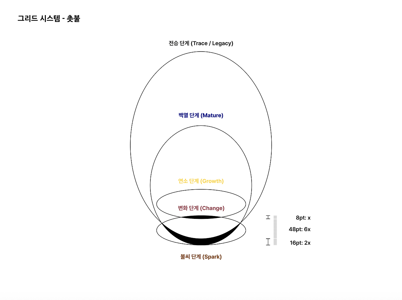 심볼은 '촛불'을 모티브로 소진이 아니라 전환, 끝이 아니라 확장이라는 내러티브로 ‘불’의 이미지가 가진 소멸성 대신 재점화 가능한 성장 루프로 재해석하여 "불씨(Spark) → 변화(Change) → 연소(Growth) → 백열(Mature) → 전승(Trance/Legacy)" 단계의 그리드 시스템을 만들었고, x height를 무한한 가능성을 상징하는 8로 설정하였다.