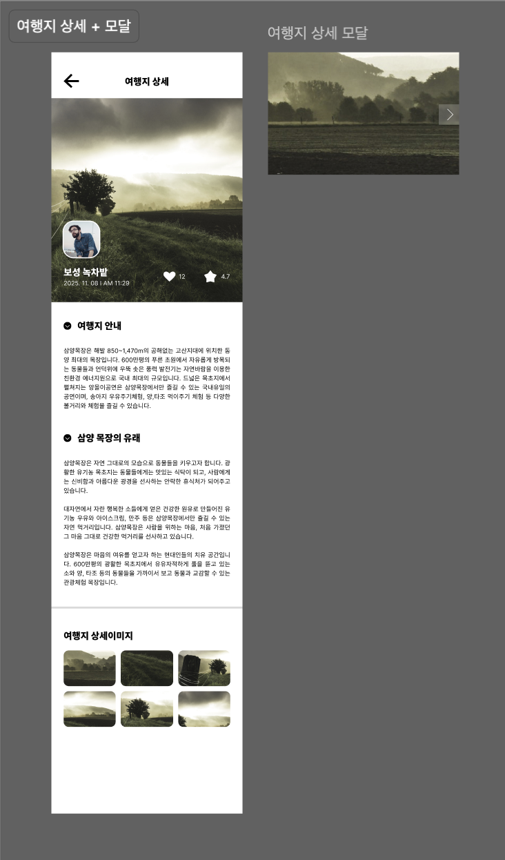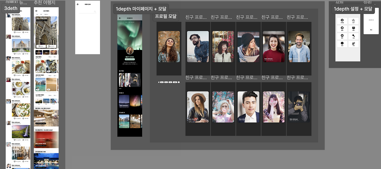 본격적인 피그마 디자인 실습도 거쳤다. 예제 작업에서 조금 더 나아가서 개인적으로 원하는 디자인으로 좀 더 수정해보았다. 나는 그 중에 홈 화면과 추천 여행지, 마이페이지를 중점적으로 변경해보았다.