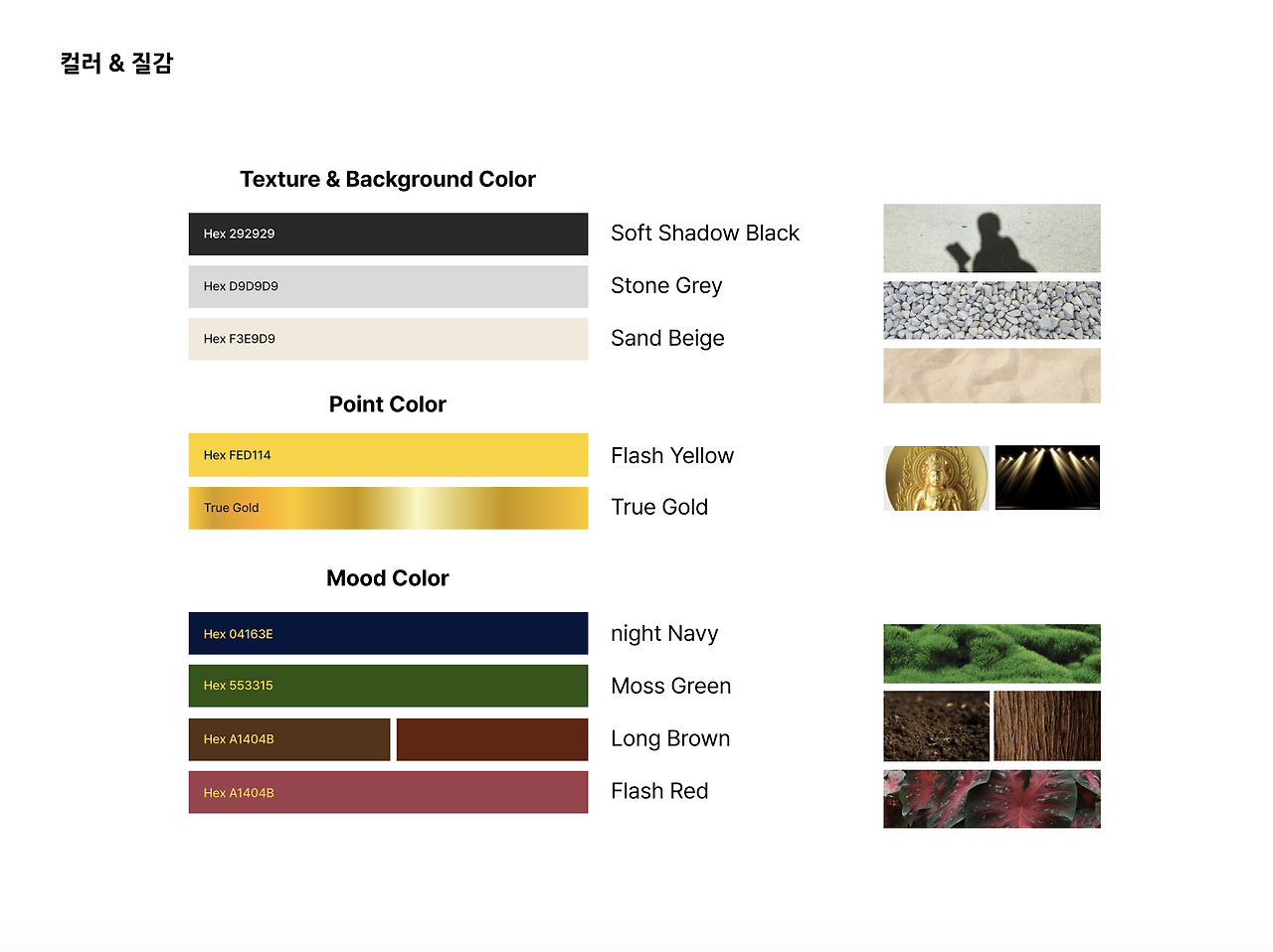 컬러 역시 브랜드 모델이 없는 코스메틱 브랜드이자 누구나 모델이 될 수 있는 매거진 브랜드로 사용자의 태도를 “조명"하는 브랜드이기 때문에 Soft Shadow Black, Stone Grey, Sand Beige로 튀지 않는 배경 컬러와 Moss Green, Long Brown, Flash Red 등의 자연으로부터 비롯된 무드 컬러, "영원히 변하지 않는다"는 본질적 가치를 의미하면서 "조명"을 의미하는 True Gold, Flash Yellow를 포인트 컬러로 정했다.
