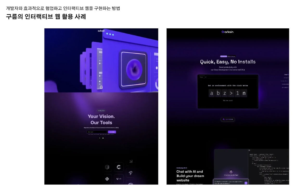 다른 특강과 다르게 좋았던 점은, 구름에서 제작했던 아케인 사이트의 초기 버젼과 인터렉티브 버젼을 실제로 경험해볼 수 있었던 것이었고 구름에서 실제로 활용했던 레퍼런스 사이트, 실습 예제가 주어져서 활용해볼 수 있었던 점이었다. 다양한 AI 툴을 활용해서 프로토타입 구현을 해보는 것을 시도해보아야겠다는 생각이 들었다.