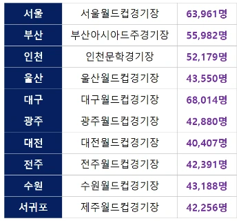 *2002년 한일 월드컵 개최 도시 열 곳: 서울, 부산, 인천, 울산, 광주, 대전, 대구, 수원, 전주, 서귀포