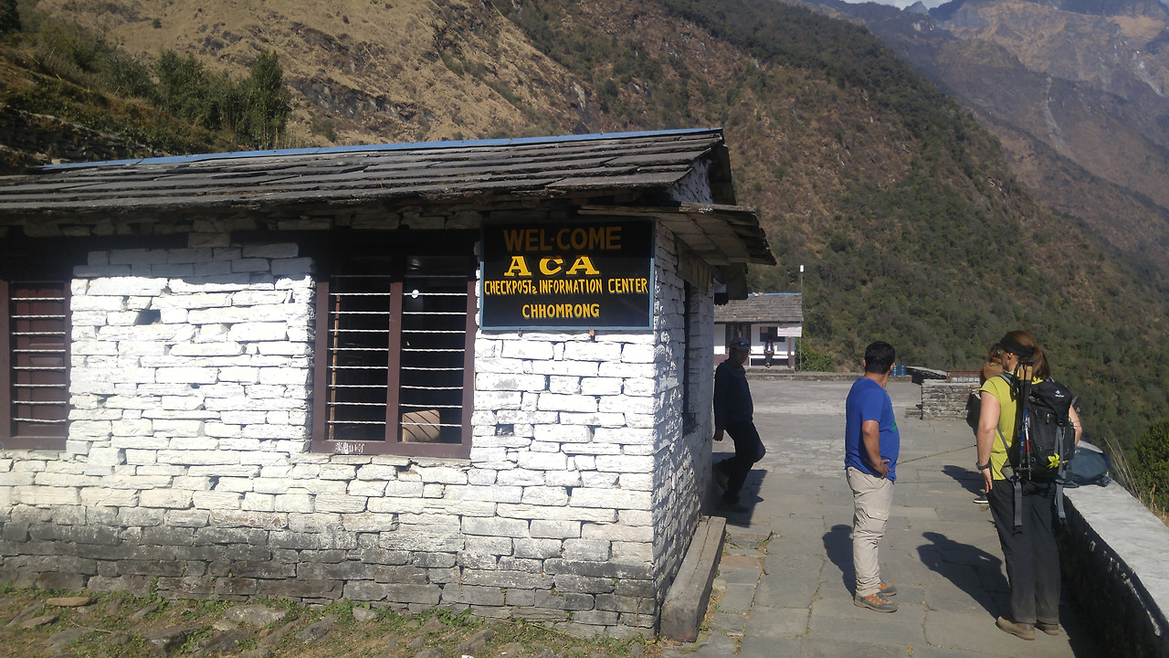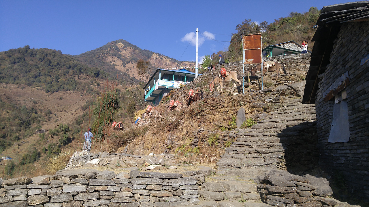 촘롱이라는 마을은 어제 내가 묵은 지누라는 곳보다 훨씬 규모가 크다. 트레킹을 하는 사람들은 주로 여기서 하루를 보내는 것 같다. 로지의 종류도 더 다양하고 레스토랑도 있는 것 같고, 주변에 아기자기한 마을과 소, 말 등의 가축도 꽤 많다. 그리고 고도가 높기에 그림 같이 펼쳐진 자연을 감상하기에도 일품이다. 이곳에서 최종 도착지인 ABC(AnnapurnaBase Camp)로 가기 위한 여행 허가증을 발급받고, 다시 발걸음을 내딛는다. 다행히 내리막길이다.