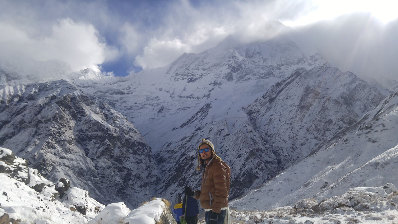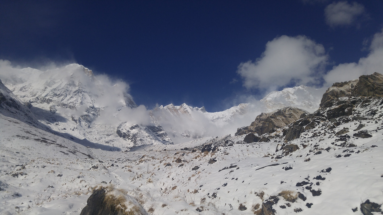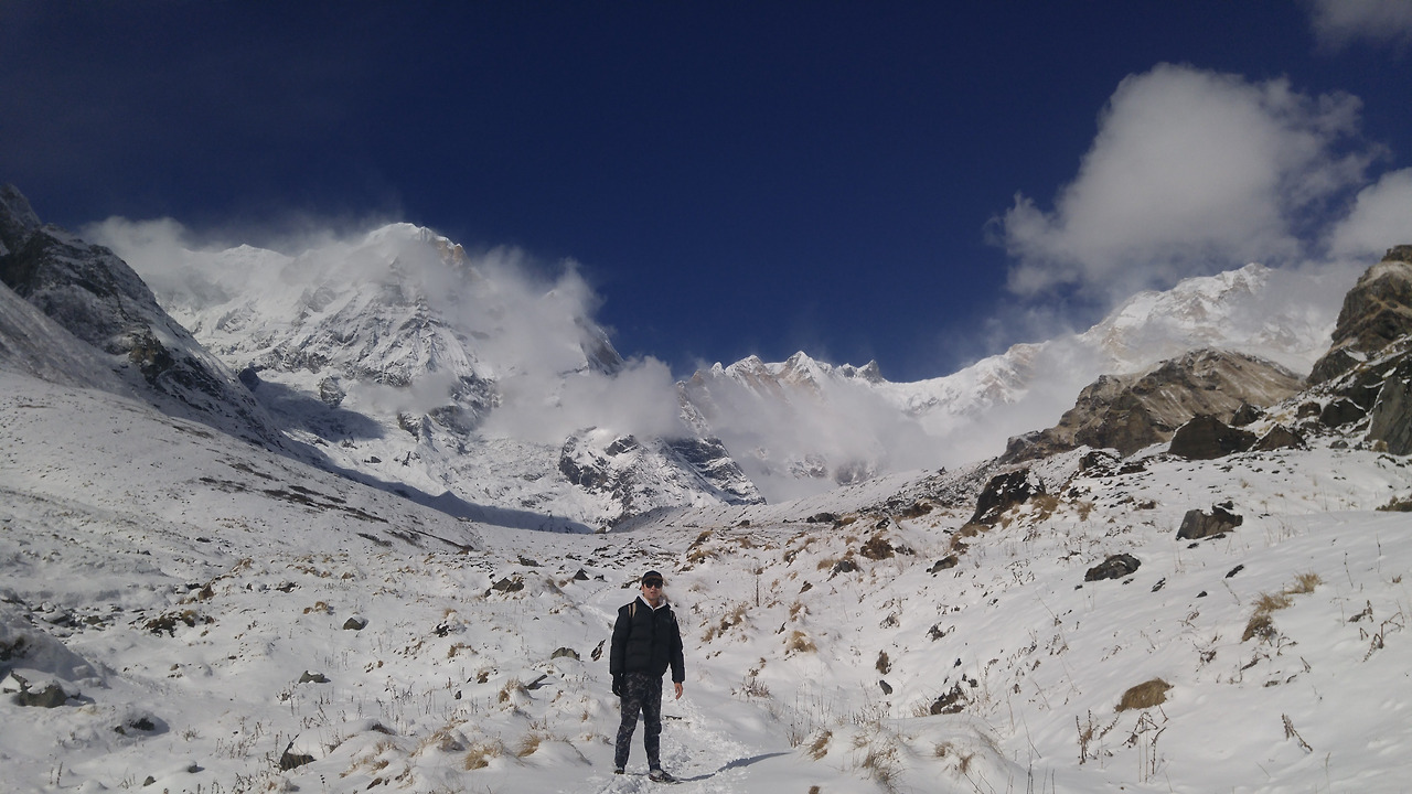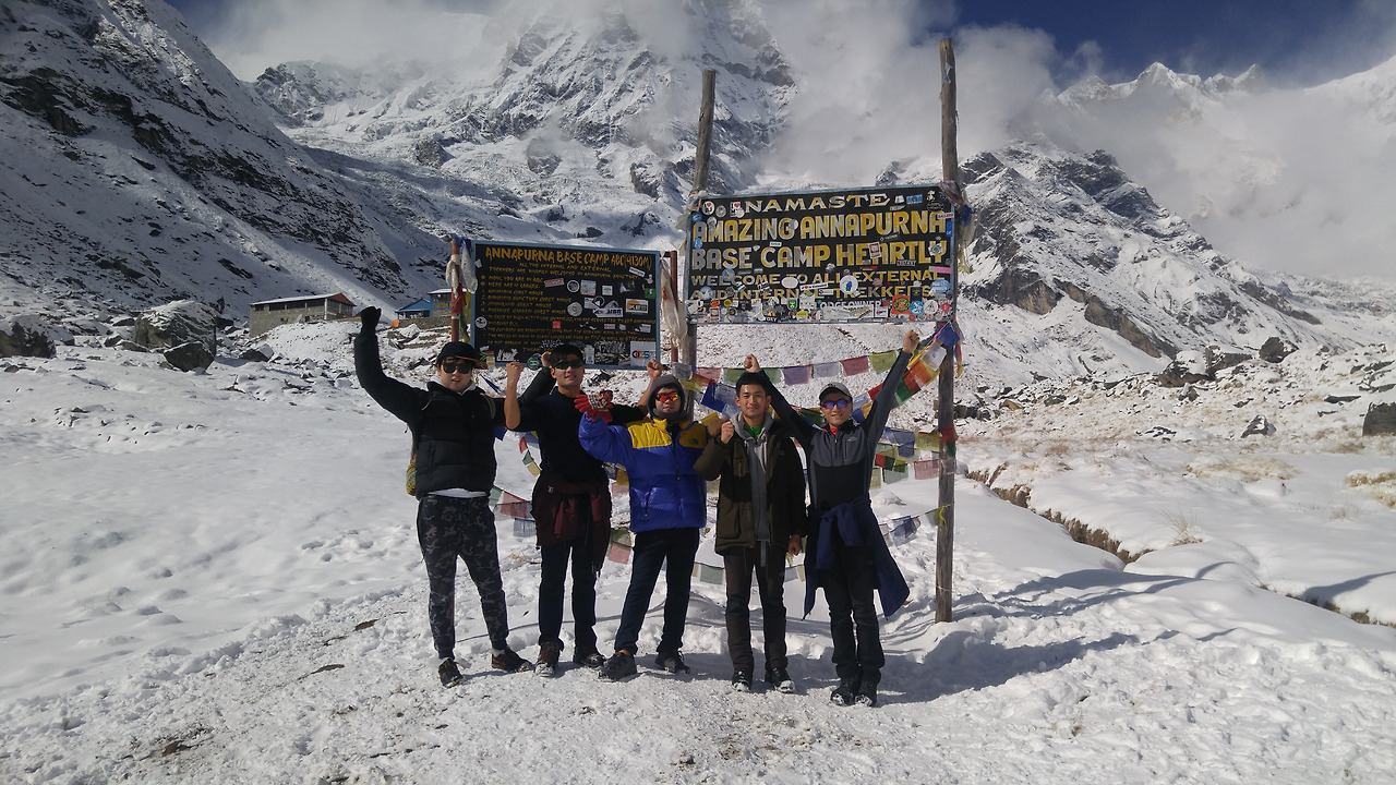 배를 잡고 데굴데굴 쓰러지는 띠동갑 친구들(히말라야에서의 적당한 과장과 허풍은 용서되는 법)! 동갑이라고 굳게 믿고 농을 친다. 사실은, 광고회사를 다니고 있으나, 곧 이 일을 그만두고 작가가 될 것이다. 그때 너희는 나랑 찍은 사진을 매우 자랑스럽게 여기게 될 것이다. 그러니 오늘을 꼭 기억하라고 또 한 번의 과장과 허풍을 바람에 실어 날려 보낸다. ‘하하하’ 허풍스러운 웃음과 ‘오오오’ 고풍스러운 감탄사가 묘하게 섞여 따뜻한 분위기가 형성되고 이 기세를 타고 차가운 바람이 쫓아오는 해발고도 4200미터 ABC를 향해 고속 질주한다.