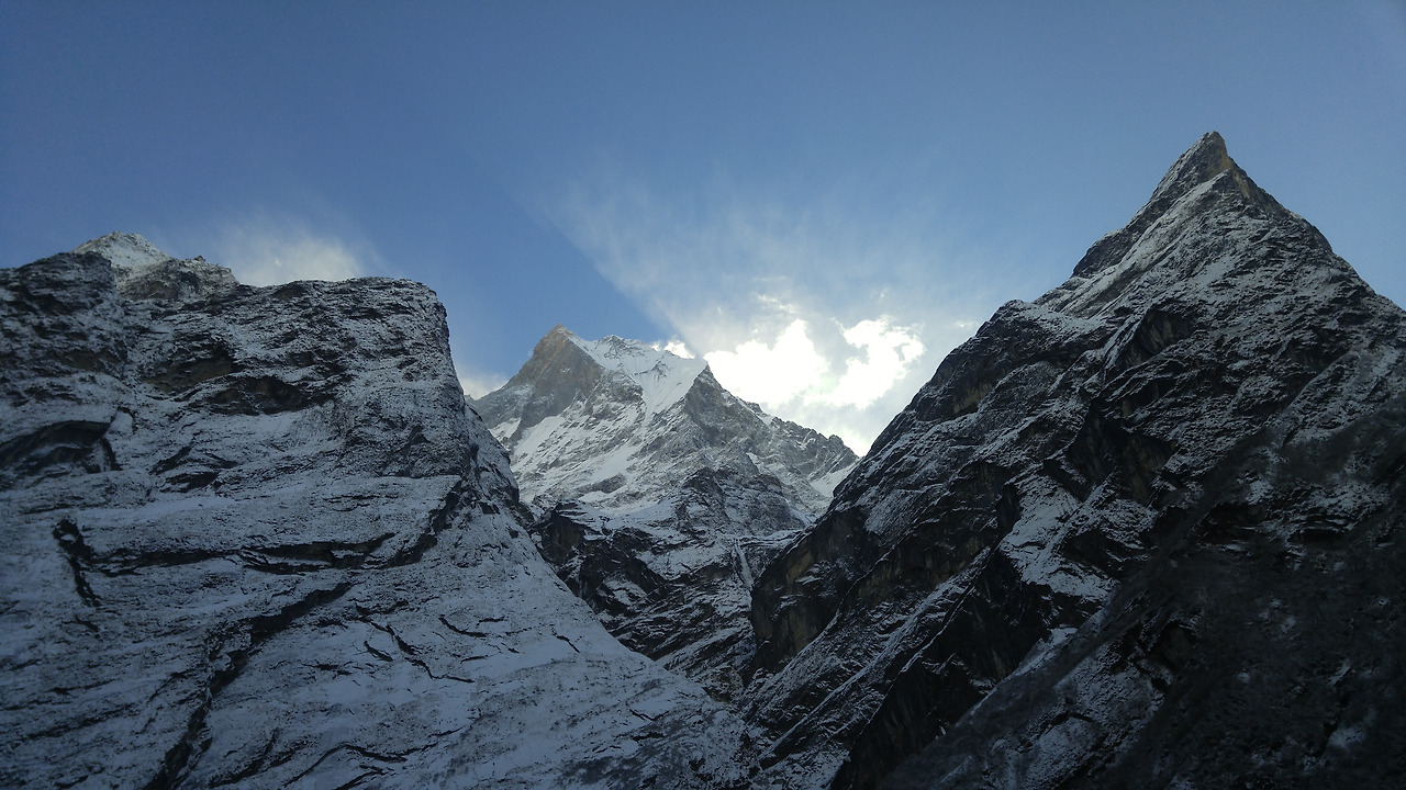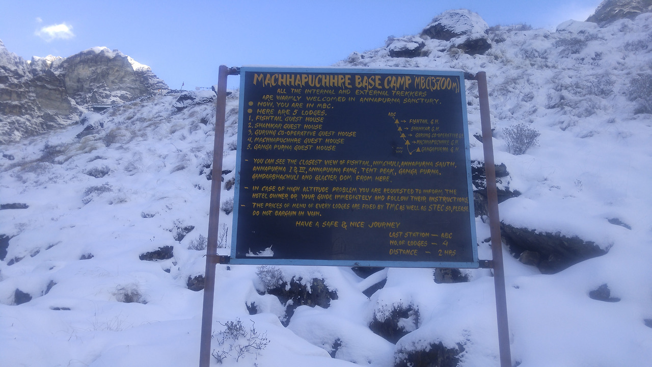 MBC와 최종 도착지인 ABC는 모두 전문 등산객을 위한 베이스캠프(Base Camp)가 되는 곳이다. 특히 봉우리 모양이 매우 특이한 곳을 베이스캠프로 삼고 있는 MBC는 마차푸체르 베이스캠프의 준말인데, 크리샤는 앞 글자의 'M'이 한국어로 ‘솅선꼬뤼’라고 매우 정확한 발음으로 우리에게 알려준다. 그러고 보니, 새파란 하늘 아래서 새하얀 구름들을 순찰 중인 저 봉우리가 ‘생선 꼬리’랑 꽤 비슷하게 생겼다. 나를 포함한 5명의 전사와 크리샤는 생선 꼬리를 배경으로 보기 좋게 기념사진을 찍고 MBC에 입성한다.