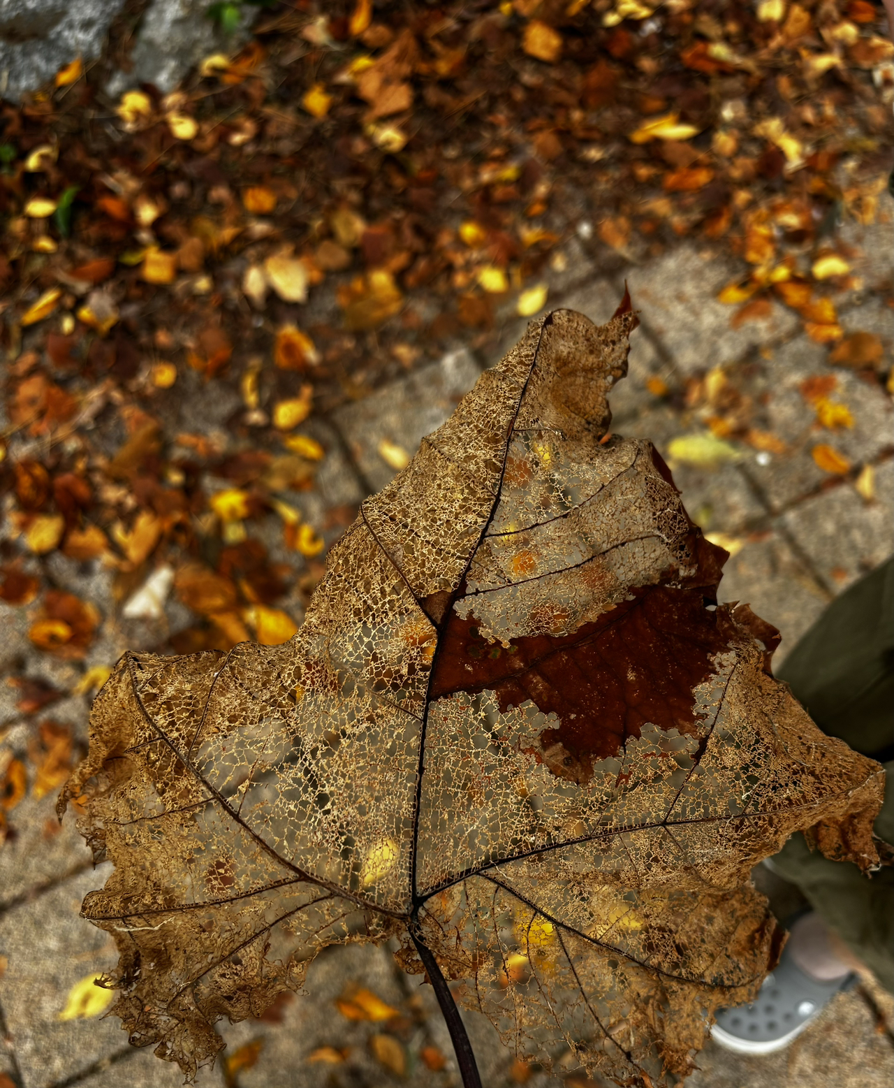 여름내 푸른 부채처럼 햇빛을 가려줬던 플라타너스 잎이다. 어느 부지런한 벌레가 플라타너스 잎을 이만치도 갉아먹었을까.