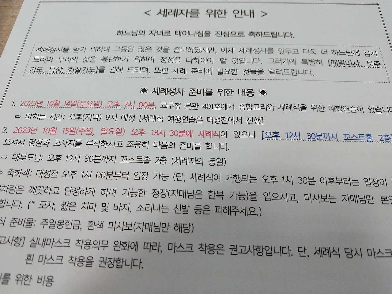 또다른 안내 프린트물에는 세례 준비에 대한 내용이 적혀 있었다. 주일 봉헌금은 항상 가방 한 쪽에 있는거고 미사보는 대모를 서주기로 한 친구가 해주겠다고 했으니 나는 당일 옷만 제대로 입고 늦지 않게 도착하면 되지 않을까 싶다.