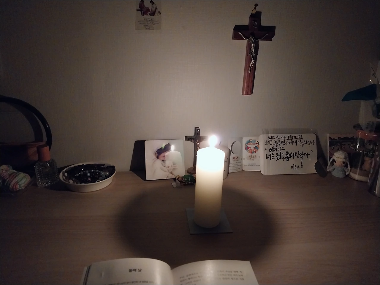 초를 켜고서 9일 기도를 하려니 느낌이 새롭다고 해야 하나. 아직 라이터는 낯설고 돌려서 켜는 라이터는 영원히 못쓸듯 싶지만 평소 쓰는 라이터로는 알아서 불을 켜고 끌 수 있게 되었다는게 신기하다. 아직 완전히 끝난 것은 아니지만 그래도 막바지를 향해 가고 있다는 것이 직접 느껴지니 끝이 다와간다는 것도 실감난다. 마지막까지 그간 해왔던 것처럼만이라도 할 수 있기를. 그리고 침묵으로 조용히 기도하며 인내하고 기다리기를.