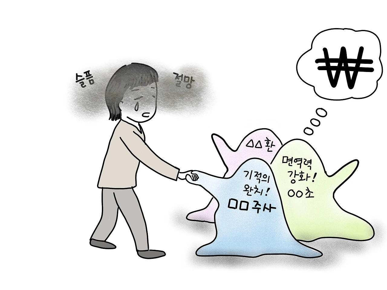 항암치료를 받다가 언젠가부터 진료실에 나타나지 않는 환자들이 있습니다. 대개는 수개월 후 더 악화된 상태로 내원합니다. '자연요법' 또는 '식이요법’ '면역력 강화 치료'이라는 것을 했는데 효과가 어떤지 보고 싶다며. 그리고 검사결과를 확인한 뒤 실망한 눈빛으로 진료실을 떠납니다. 대체요법을 선택하는 더 흔한 경우는, 더 이상 항암치료가 효과가 없고 도움이 되지 않으니 호스피스 돌봄을 고려하자는 말씀을 드렸을 때입니다. 이제 죽는 건가, 더 이상 희망이 없나, 하며 인터넷 포털사이트에 '말기암'이라는 키워드로 검색할 때 바로 등장하는 것은 고주파온열암치료. 고농도 비타민주사. 미슬토주사. 대학병원에서 포기한 환자도 치료가능. 차가버섯. 후코이단. 아베마르. AHCC. 키토산.......지푸라기라도 붙잡는 마음으로 클릭하지 않을 도리가 없습니다.