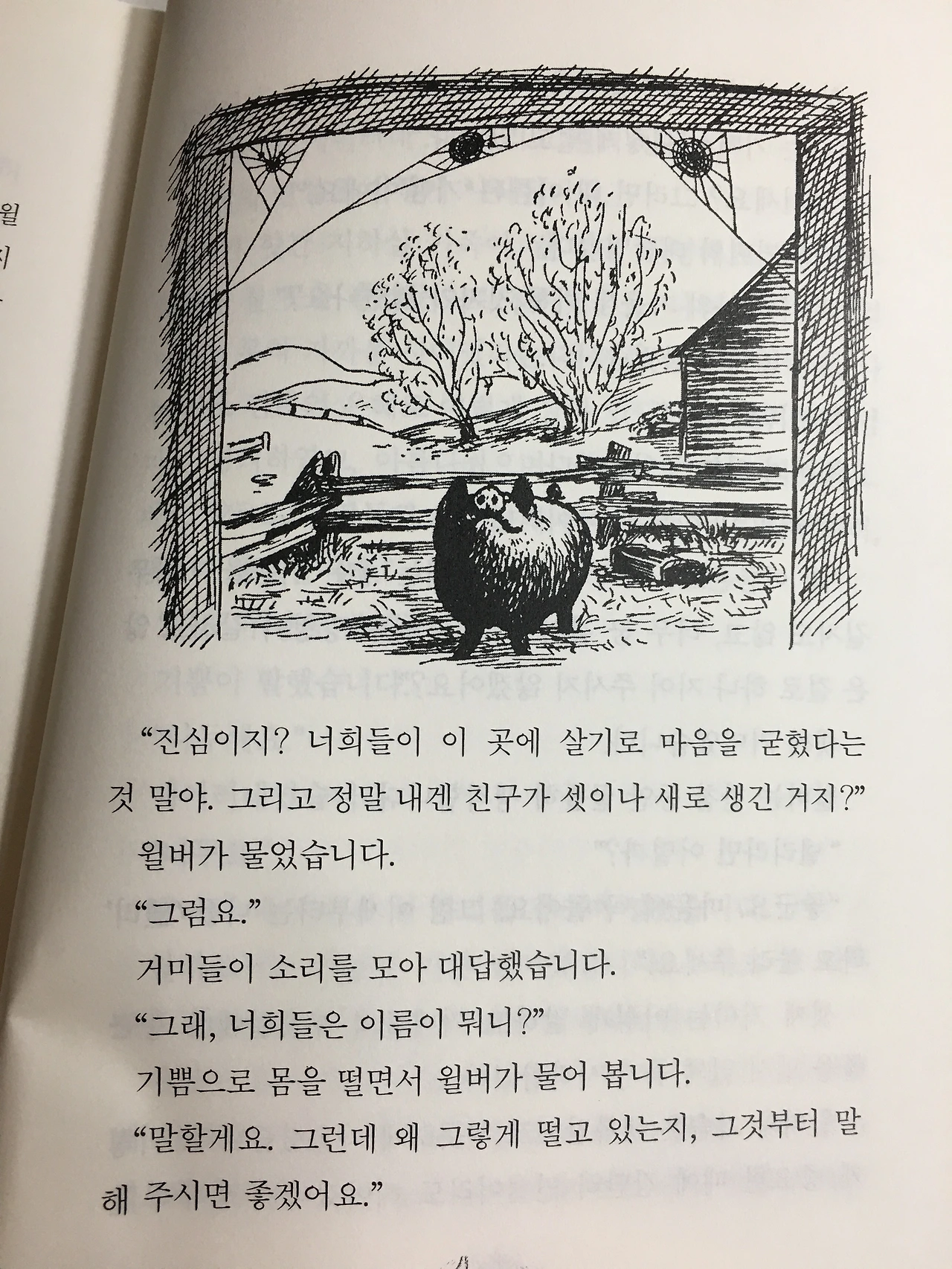 또 하나의 동화는 E.B. 화이트의 “우정의 거미줄”이다. (시공사에서 낸 번역본인 “샬롯의 거미줄”로 더 잘 알려져 있지만, 내가 읽은 것은 80년대에 나온 창비아동문고의 “우정의 거미줄”이다.)동화작가 케이트 디카밀로가 ‘아이들에게 어떻게 슬픔에 대해 이야기할지’에 대해 동료 동화작가에게 쓴 편지 형식의 글[1]에서 이 책이 언급된 것을 읽고 나는 많이 울었다.