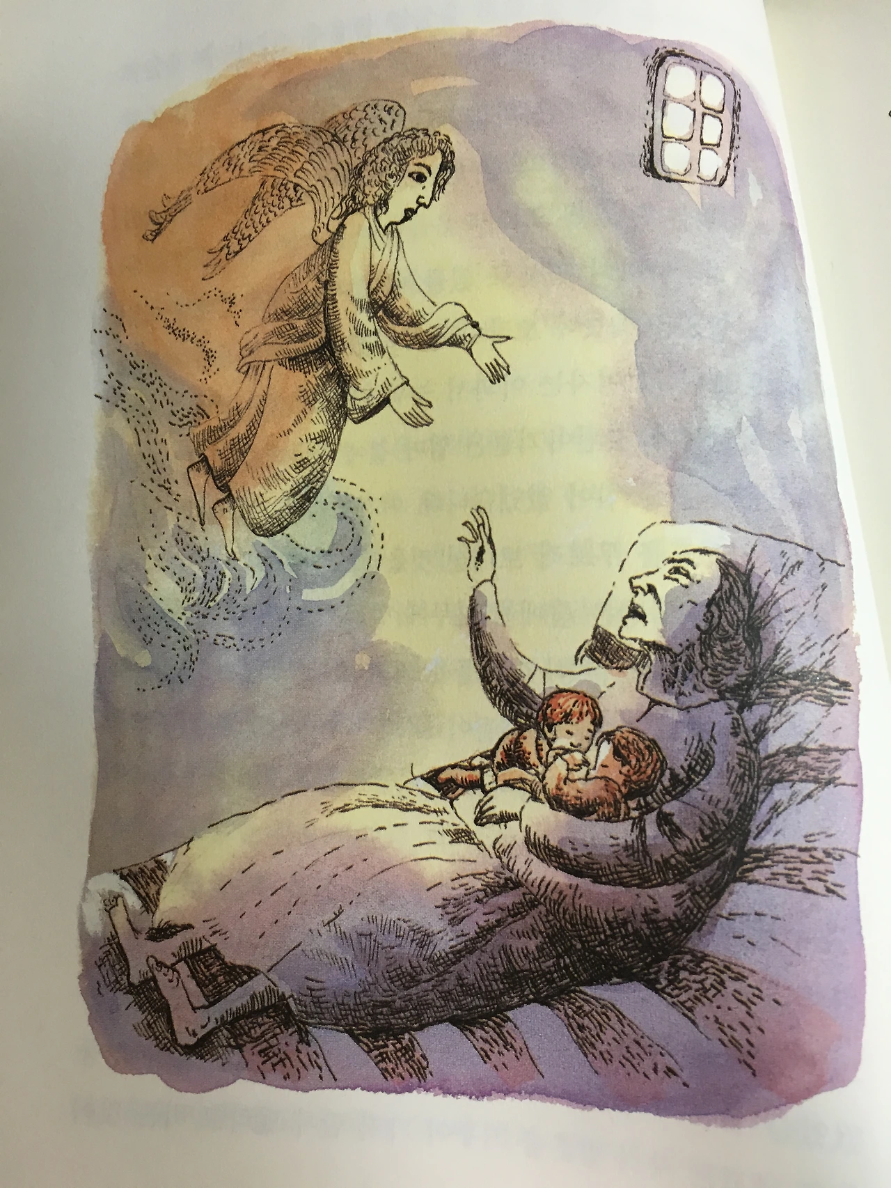 톨스토이의 ‘사람은 무엇으로 사는가.’ 수일전에 사고로 남편을 잃고 쌍둥이 아이를 해산한 어머니의 영혼을 데려가기 위해 내려온 천사에게 그녀는 빌고 있다. “내가 죽으면 이 아이들은 누가 돌보느냐”고 읍소하는 어머니의 말에 천사는 빈손으로 올라가지만, 그 일로 하느님의 노여움을 사서 날개를 잃고 인간 미하일이 되어 내려오게 된다. 구두장이 시몬에 의해 구조되어 그곳에서 일을 하게 된 미하일은, 쌍둥이 아이를 거두어 키우는 부부가 아이들의 구두를 맞추기 위해 방문한 것을 보고 깨달음을 얻게 된다. "사람은 자기 자신에 대한(또는 가족에 대한) 걱정으로 살아가지만, 사실은 사랑으로 살아가는 것이다."