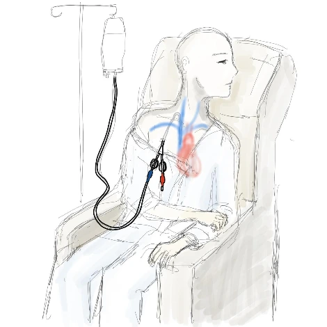 한 의료사회학자가 자신의 항암치료 이야기를 쓴 책인 <아픈 몸을 살다>[1]에서 글쓴이 아서 프랭크는 중심정맥관 (체외로 일부 노출되어 있는 히크만 카테터인 것으로 보인다)이 자신의 삶에서 차지했던 의미에 대해 말한다.