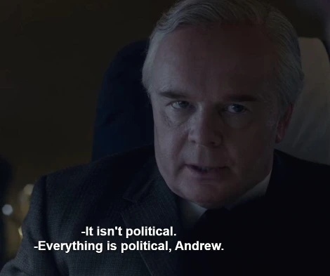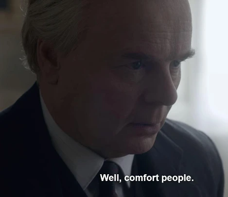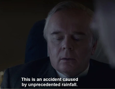 해럴드 윌슨 총리가 사고 당일 여왕의 비행기를 빌려 현장으로 가는 장면이다. 이 비극이 예측하지 못한 폭우로 일어난 일이며 정치적인 문제가 아니라는 보좌진의 말을 그는 "모든 것은 정치적이다"라며 일축한다. 1960년대에 벌어진 이 사고가 그나마도 세월호보다 나았던 부분은 총리의 태도인 것 같다. 물론 그 또한 극 중후반에는 어떻게든 재난으로 인한 정치적 위기를 모면해보려는 모습도 보이지만, 어쨌든 사고 당일 달려간 것은 맞다.