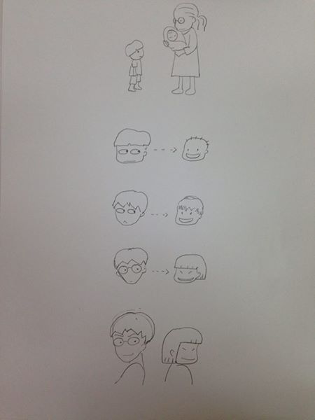 페이스북에 게시했던 그림들을 살펴보노라니 이런 그림도 눈에 띈다. 계속 동생을 신경써오던 눈길에는 엄마아빠의 사랑을 독차지할까봐 불안해하는 마음도 있지만, 귀엽다는 느낌, 호기심, 신기함 등 복잡한 마음 역시 담겨 있다. 동생이 슬슬 말대답(!)을 할 정도로 성장을 했을 즈음 오빠와 동생은 서로 너에 대한 파악은 완료되었다는 신호를 보내고, 이제부터 남매의 한판 싸움과 그 속에 싹트는 동지애는 시작되는 것이다.