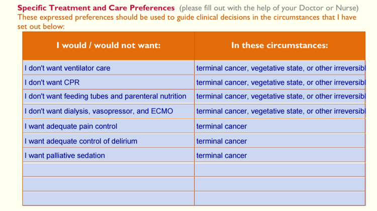 그 다음으로는 내가 죽어가는 상황에서 구체적으로 어떤 것을 원하는지 체크리스트 형식으로 적도록 하고 있습니다. 보통은 '고통없이 순식간에 저 세상으로 갔으면 좋겠다'고들 말하지만, 삶이 항상 원하는대로 되지 않듯이 죽음도 마찬가지입니다. 모든 것을 통제할 수는 없고, 다만 내가 원하는 것을 미리 밝혀놓으면 가족과 의료진은 최대한 그 방향으로 노력할 수 있을 뿐이지요. 저는 가급적 나를 편안하게 해줄 것, 급식튜브나 배액관 및 카테터는 증상조절에 도움이 안된다면 제거할 것, 가족과 친구들과 함께 하는 것, 불필요한 약제는 끊는 것, 영적 돌봄을 받는 것에 체크하였습니다. 먹고 마시는 것은 실제 말기에 도달하였을 때 크게 중요하지 않을 수 있기 때문에 체크하지 않았습니다. (지금은 중요하지만....^^;;;)