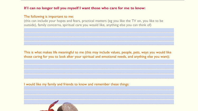 이 양식에서는 작성자에게 3가지 질문을 먼저 던집니다. “만약 내가 죽음에 임박하여 스스로 의사표현을 할 수 없게 될 경우, 나를 돌보는 이들이 알아주었으면 하는 것들” 대한 것들입니다. 그리고 그에 대한 저의 대답은 다음과 같습니다.