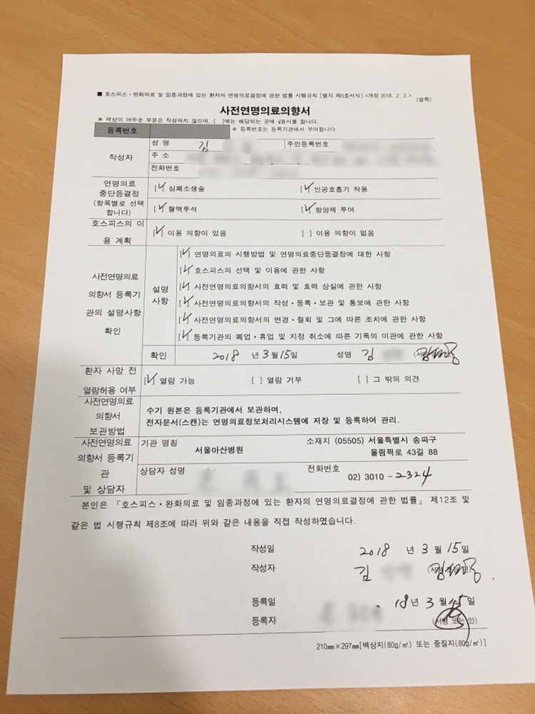 아무튼 저는 이렇게 사전의향서를 쓰고 나왔고, 남편에게만 제가 작성한 것을 찍은 사진을 보냈습니다. 생각보다 너무 간단하고 썰렁한 과정입니다. 하지만 삶과 죽음은 그렇게 간단하지 않기에 아무래도 쉽게 쓰기가 망설여지는 것 같습니다. 이 무미건조한 형식에 서명함으로써 자신의 죽음 역시 무미건조해지고 의미를 잃는 것처럼 여겨질 수도 있겠습니다.