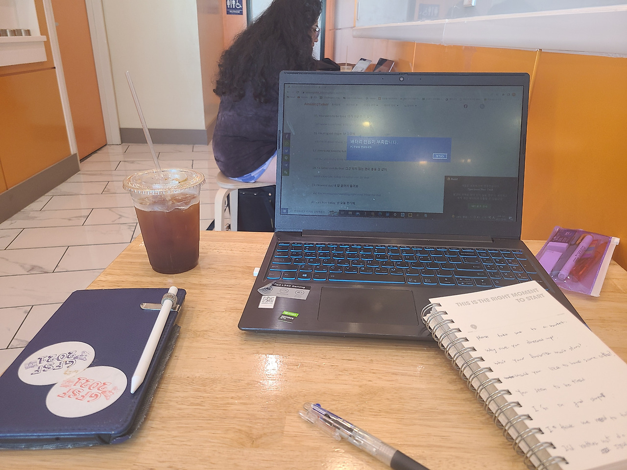 카페에서는 계속 영어공부를 했다. 미국에 온지 불과 3,4일 정도 밖에 안되었어서 더 영어가 낯설고 막연하게 느껴졌던 것 같다. 그러다 보니 뭐라도 하자는 마음에 인터넷에 들어가 '일상 100문장'을 무작정 공책에 썼다. 라스베가스 호텔에서도 영어의 문장을 쓰는 공부를 했었는데, 도움이 많이 됐던 기억이 있기에 시작한 것이었다. 미국에 와서 쓸 수 있는 문장의 표현을 많이 가져가야 살아남을 수 있겠다는 생각과 동시에 용을 쓰고 싶었던 것 같다. 너무 안되니 답답한 마음이 컸다.