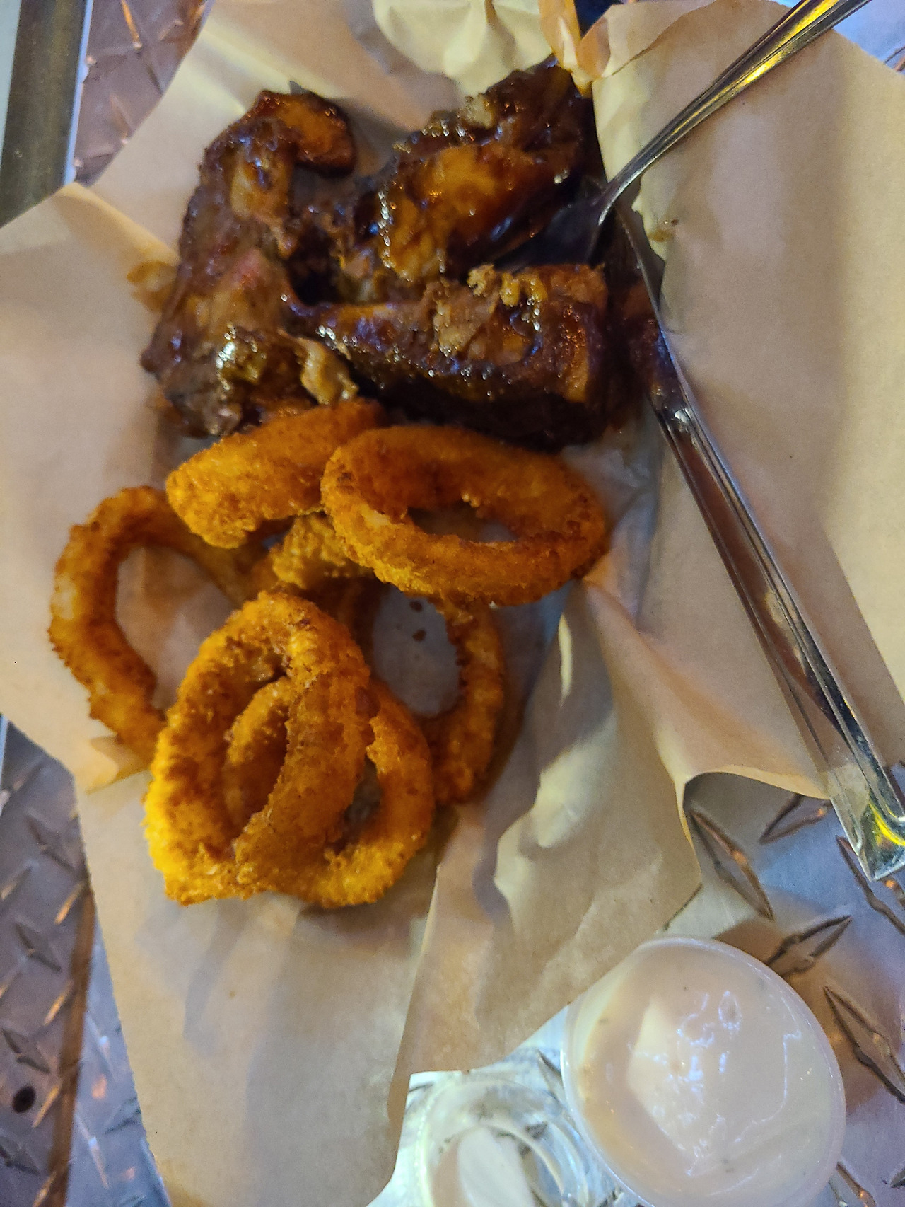 정말 맛이 없었던 BBQ의 립부분!! 나는 매운 것을 시켰었는데, 매운게 매운게 아닌 이곳의 맵기였다. 그리고 무엇보다 고기 자체의 맛이 익숙하지 않은 육향이었다. ㅠㅠㅠㅠㅠ기대를 많이 했는데, 생각보다 맛이 없어서 놀랐다. 그리고, 구글맵에서 본 메뉴 리뷰에선 밥이 있길래 기대했는데, 내가 그것까진 어떻게 시킬 줄 몰라 옵션을 다 구성하지 못한 것 같기도 하다(추가 비용이 들까봐 걱정됐었다). 아무튼 그래서 어니언링도 그닥 안 좋아하는데 먹었던 기억이다.