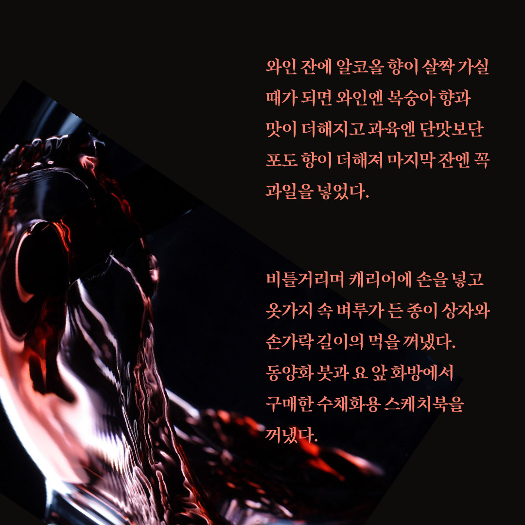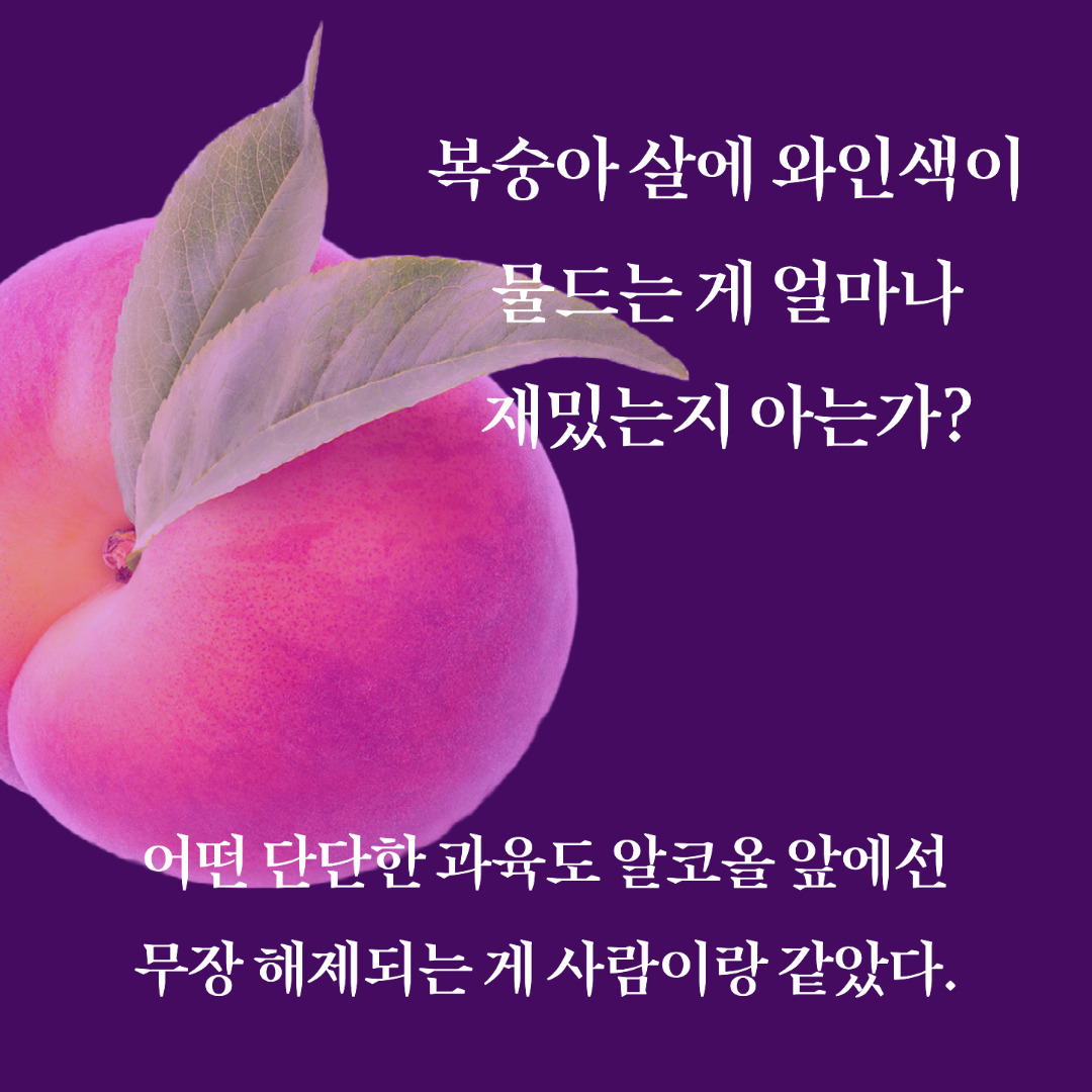대부분의 사람들이 겪었을 법한 일들이 담겼다. 부모님과의 갈등, 취업의 불안함, 감정의 표출을 어디부터 어떻게 해야 하는지 모르는 상황들이 희정의 캐리어가 이동함에 따라 휙휙 나타나고 사라진다. 일반적으로 외면하는 게 혹은 잠식되는 게 익숙한, 불편한 감정에 풍덩 빠진 희정의 삶을 따라 읽다 보면, '우리 삶을 괴롭히던 상황과 감정을 쥐고 있던 건 나와 당신이 아닐까?'라고 독자가 가만히 와인에 복숭아를 퐁당 넣고 물드는 모습을 보며 생각해보았으면 한다.