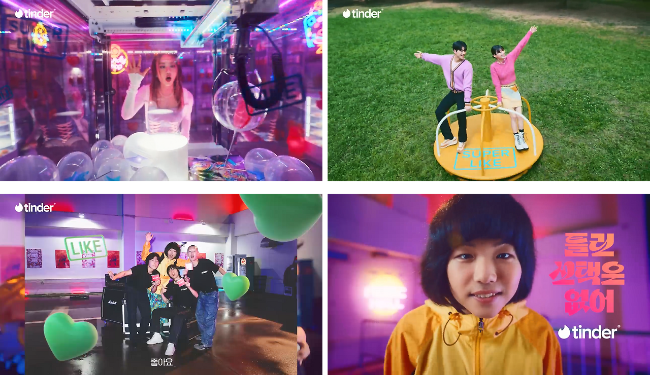 화면이 전환되어 한 여성이 인형 뽑기 기계 앞에서 유리창 너머로 뽑고 싶은 아이템을 뚫어지게 쳐다본다. 그러다가 당당하게 원하는 걸 콕 찝어서 가리킨다. 잔디 밭 위, 빙글빙글 돌아가는 놀이기구에 올라탄 커플의 발치에는 SUPER LIKE라는 글자가 쓰여져 있다. 한 사람은 앱의 UI에서 위를 가리키는 방향으로 스와이프한다. 그러자 경쾌한 알람음이 울리며 IT’S A MATCH! 라는 글자가 화면에 나타난다.