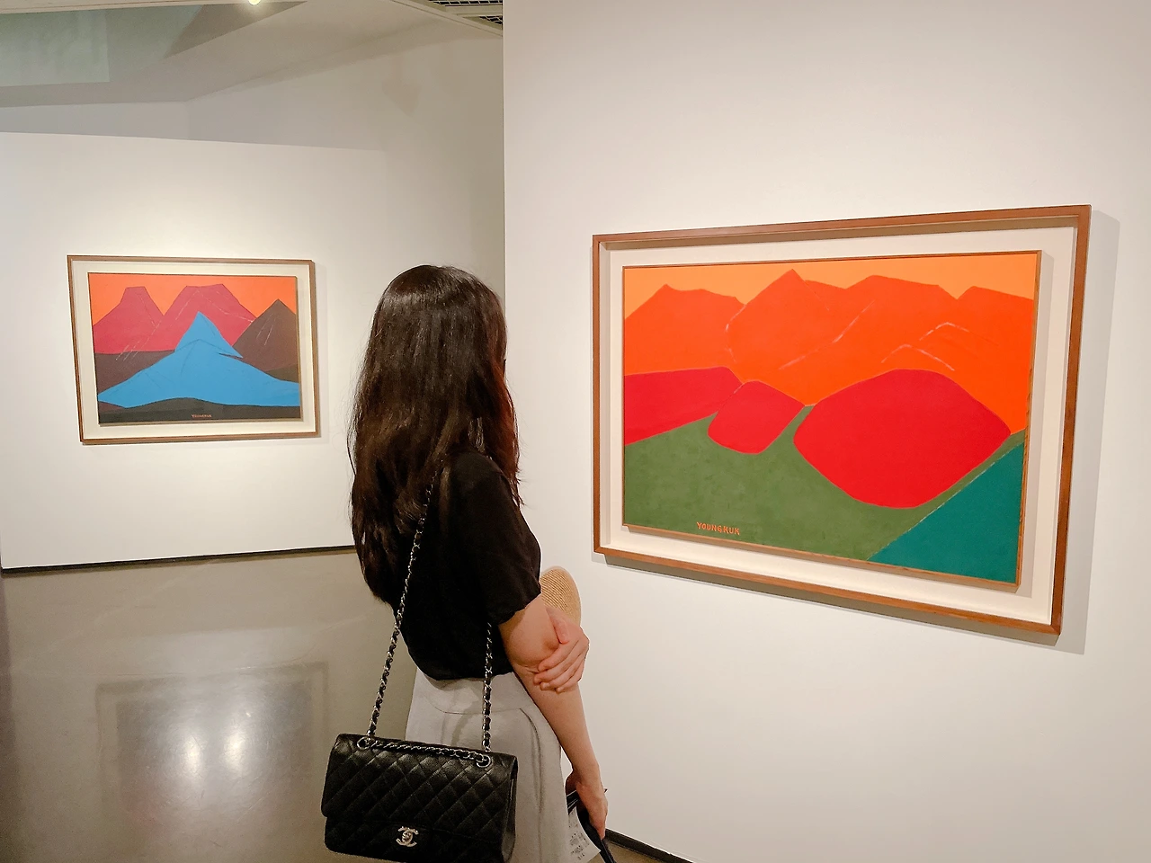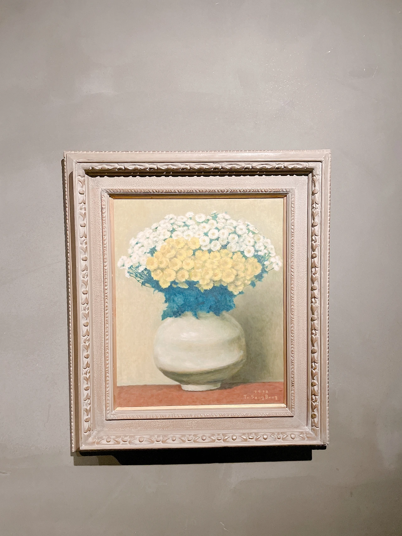 옥션 프리뷰에서도 본 적 있고, 뮤지엄산 작년 전시회에서도 봤던 도상봉 화백의 꽃이 있는 정물. 실물을 보면 백자 달항아리에 꽂혀 있는 우아한 정물에 넋을 잃게 된다. 아름다운 꽃을 화병에 꽂아 두면 그 아름다움이 시들기 때문에 무척 아쉬운데, 그림 속의 꽃은 영원히 남아 우리 곁에서 여러가지 이야기들을 전해 준다. 마치 셰익스피어가 소네트 18번에서 연인의 아름다움이 시간이 지나면서 저물어가는 것을 두려워하며 그의 시에 영원히 남긴 것처럼, 이 아름다운 꽃들도 화폭 안에 머무르는 행운을 얻으면서 1973년의 시간이 아닌, 지금 2022년의 우리와 함께 호흡하게 됐다.