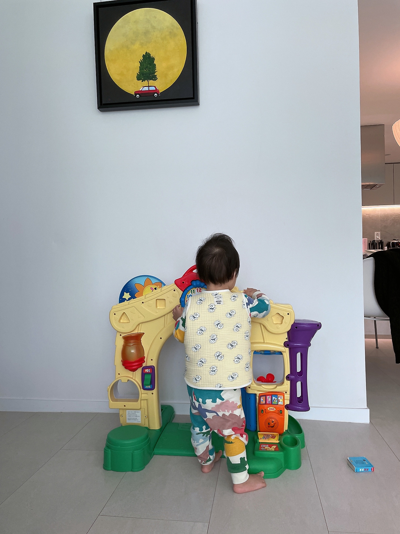 저 때는 걷지도 못하던 어린 아기였는데 지금은 어느덧 16개월이 되었다. 이 그림을 보여주면서 "달님, 안녕?"하면 꺄르르 웃어주기도 한다. 이렇게 달 아래서 자신이 좋아하는 국민문짝 장난감을 갖고 놀기도 한다. 앗, 이렇게 잠옷을 입고 머리가 뻗친 어리벙벙한 상태로도 멋진 작품을 감상할 수 있다는 것도 미술품 컬렉팅의 큰 장점이다.