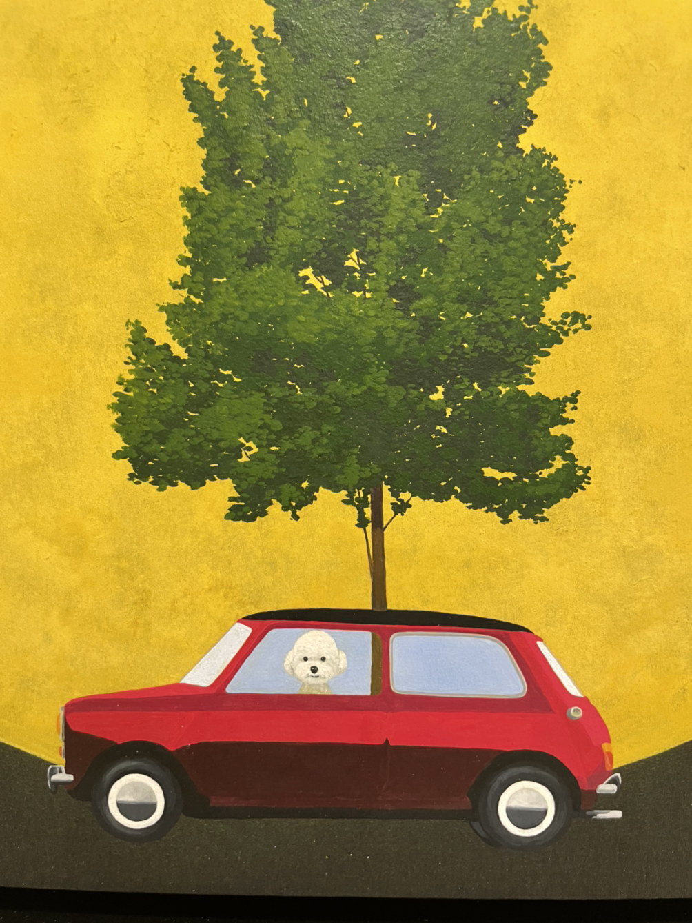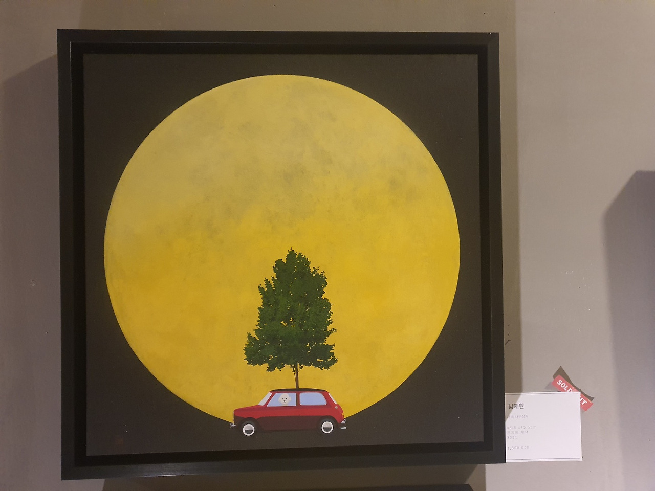 장지 위에 동양화 물감과 먹을 이용해서 실사처럼 표현된 달 그림이다. 비현실적이지만 나무 한 그루가 심어져 있는 오스틴 미니쿠퍼(작가님 피셜!)가 달 앞을 유유히 지나간다. 그 안에 타고 있는 태연한 표정의 귀여운 비숑 프리제가 인상적이다.