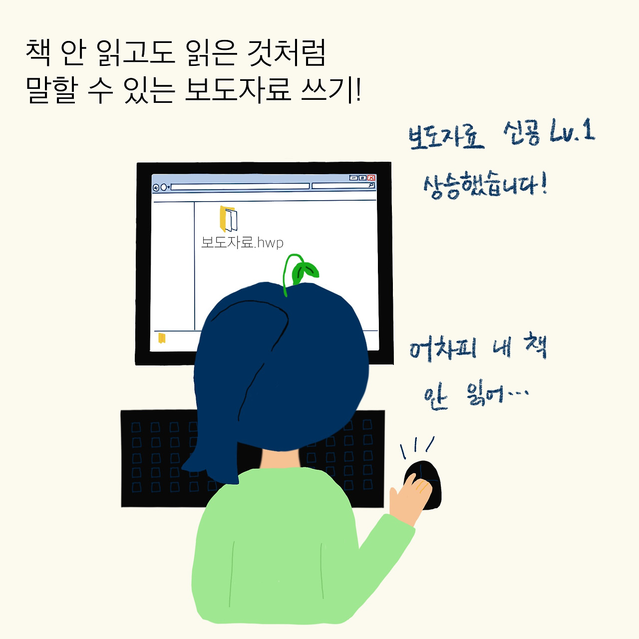 보도자료를 쓰는 데 중요한 건, 첫째로 속도다! 책이 입고되기 전에 마케터가 미리 보도자료를 들고 홍보할 수 있게끔 마감을 맞춰야 한다. 둘째는 친절함이다. 책 안 읽고도 청산유수로 설명할 수 있도록, 책의 간략한 내용과 주제 그리고 인상 깊은 구절까지 알차게 때려 넣어야 한다.