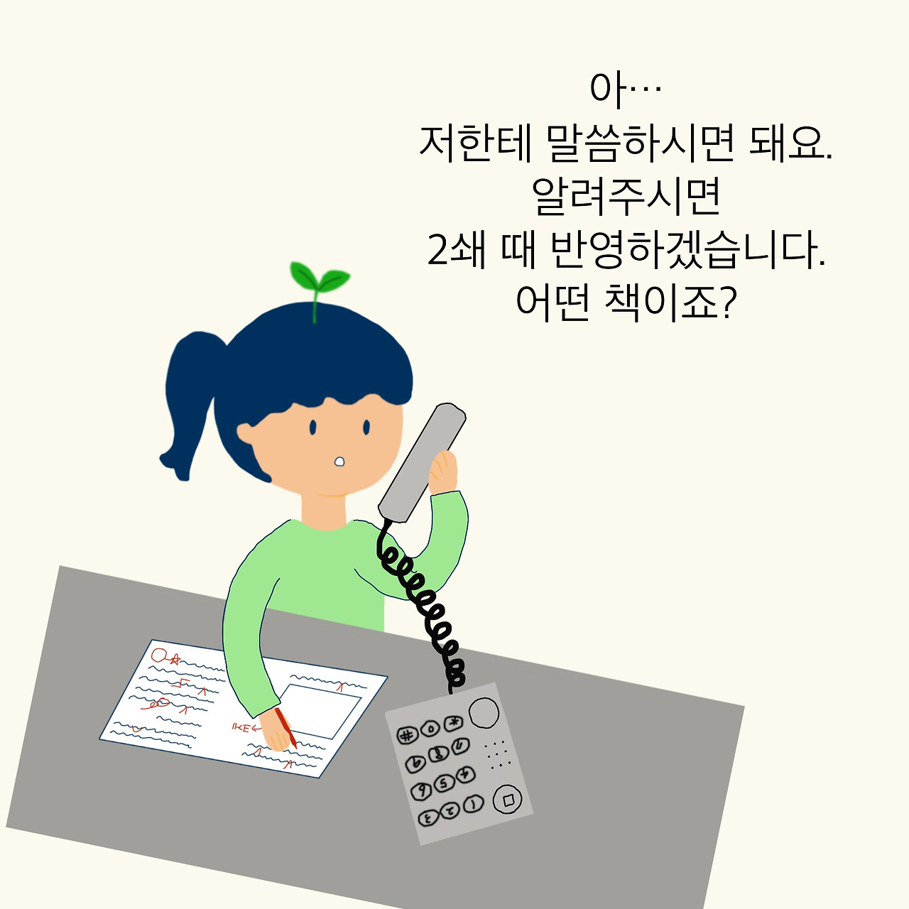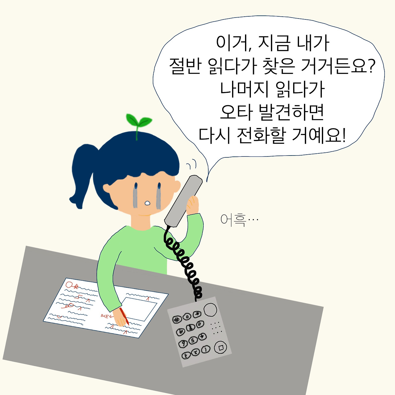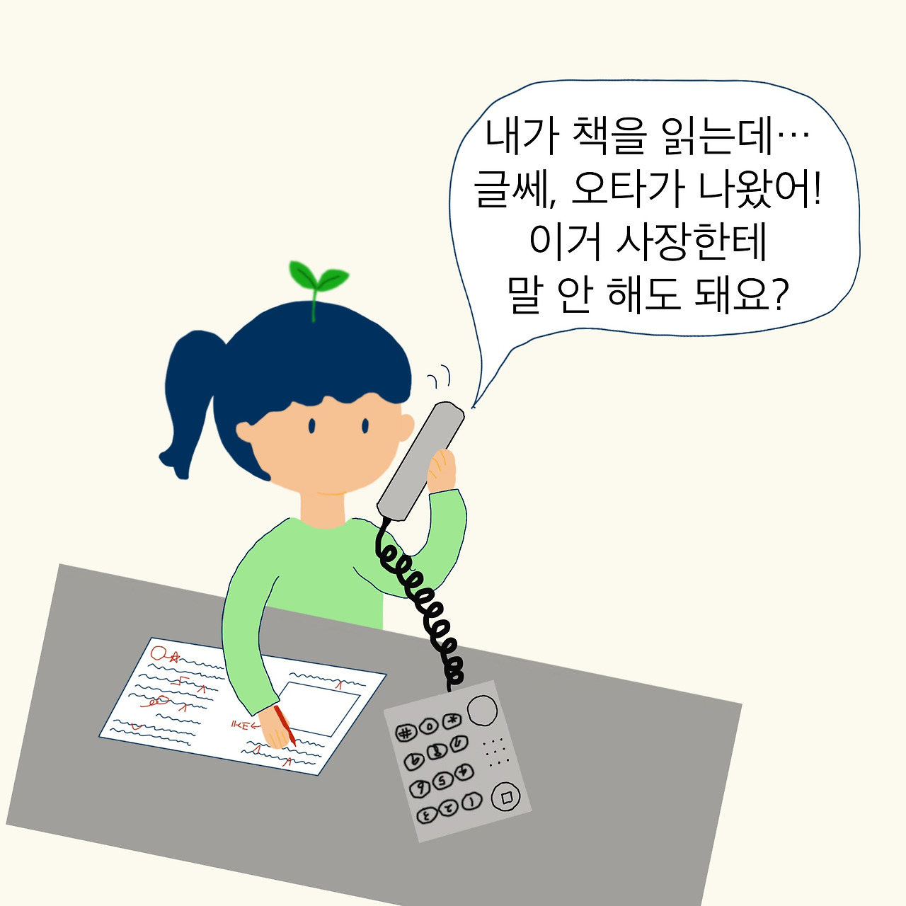 다행히 전화는 다시 오지 않았다. 과거의 나를 못 믿고, 하루 종일 쓸데없이 날 괴롭힌 셈이다. 아니, 그보다 오타가 부끄러워 빨리 덮으려던 게 잘못이다. 오히려 선배 편집자들은 ‘누구나 오타를 낼 수 있다’고 너그럽게 여겼을 텐데. (물론 심각한 오타가 아닌 경우지만.)