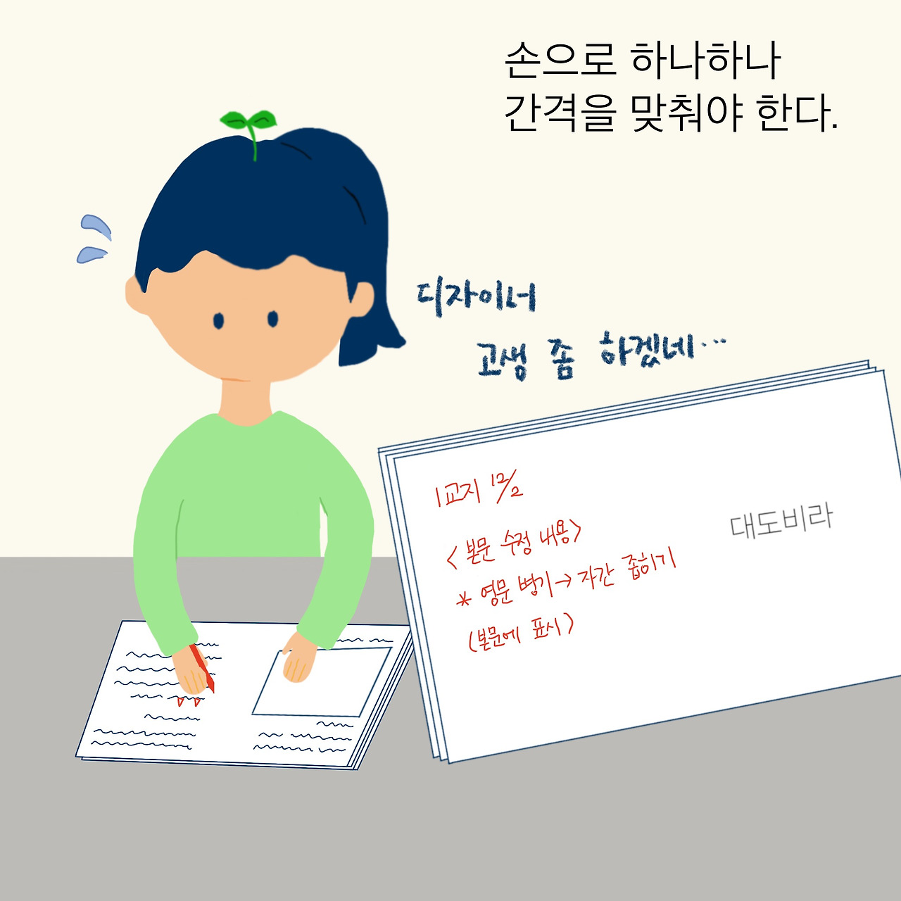 이럴 땐 자간 조정도 소용없다. 결국 눈으로 하나하나 확인해야 한다. 편집자가 자간을 붙일 곳을 표시하면 디자이너가 일일이 손으로 줄여야 한다. 말만으로도 수고로움이 느껴진다.