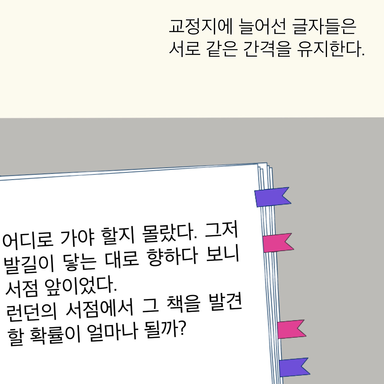 적당한 거리를 유지하는 건 어려운 일이다. 그럴 때, 누군가 사람과의 거리도 조정해줬으면 좋겠다. 자간처럼 손쉽게 좁혔다 넓혔다 할 수 있었으면...