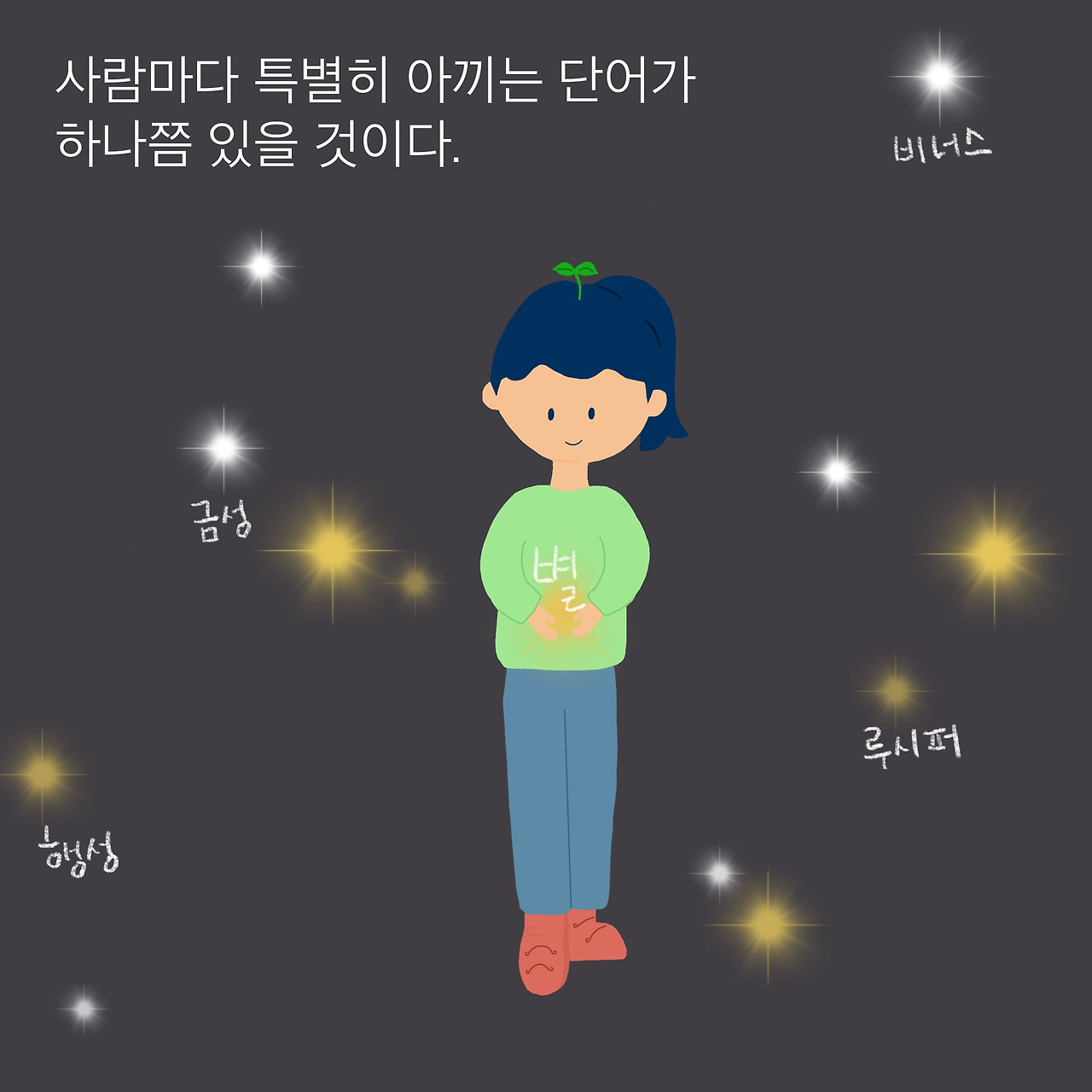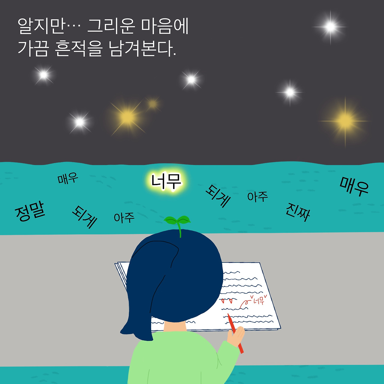 ‘너무’라는 단어에는 다른 단어로 설명되지 않는 인간의 다양한 감정이 담겨 있다. 모자라거나 넘치거나 적당하거나. 인간의 감정은 너무 다양해서 한 단어로는 표현될 수 없다.