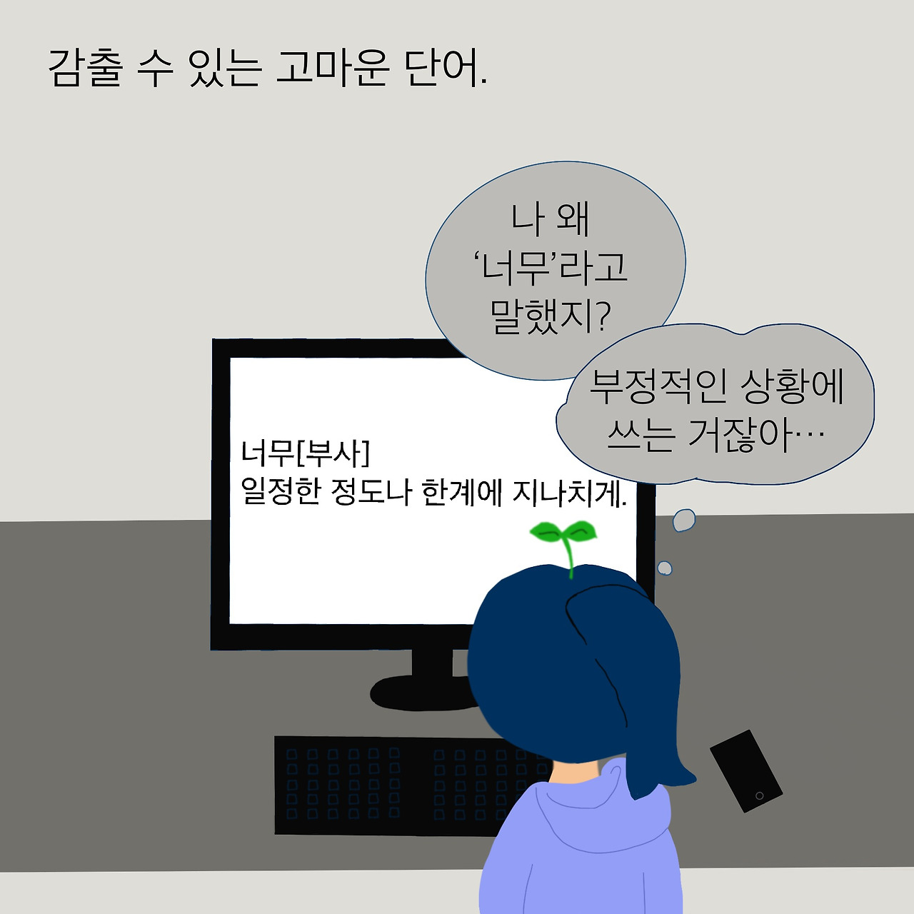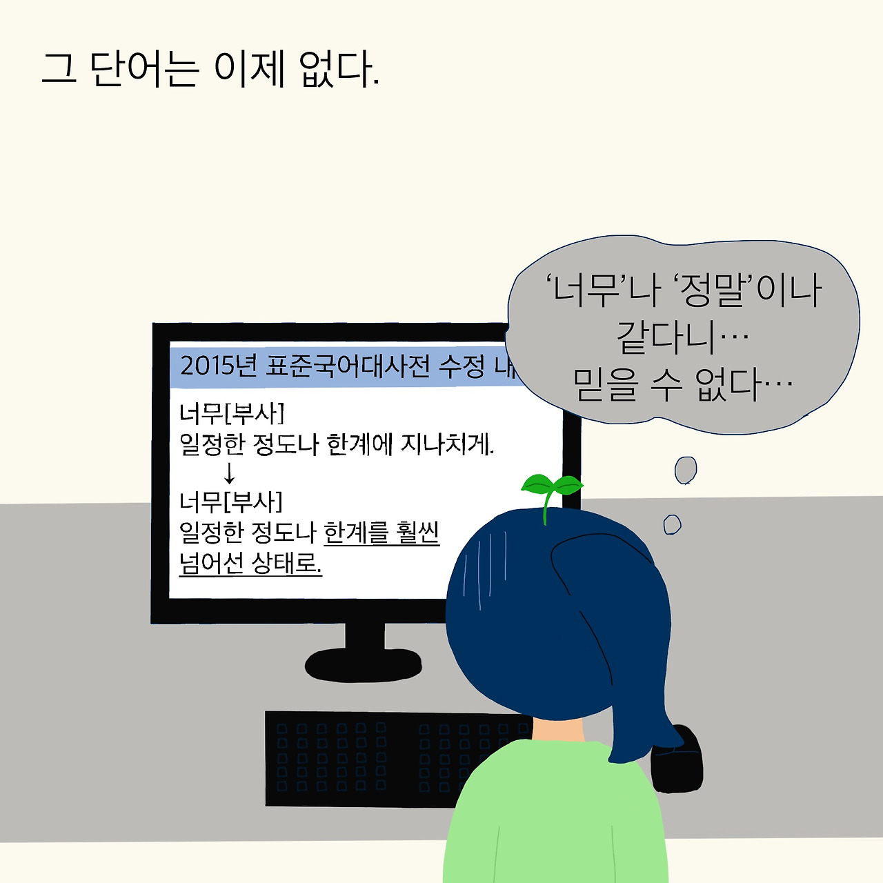 그래서 ‘너무’의 변화가 내게는 정말 슬프게 다가왔다. 낭만이 담긴, 내가 사랑했던 그 단어는 이제 세상에 없다.