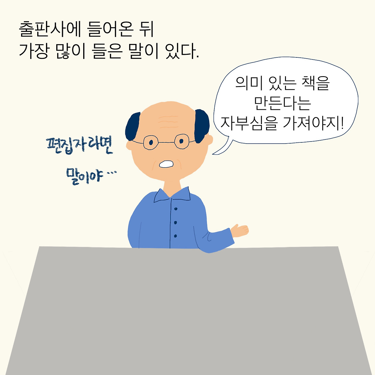 고작 책 하나를 만드는 사람일 뿐인데. 때로는 책으로 세상을 바꾸라는 큰 꿈을 강요받았다. 책 하나로 세상을 바꾸는 것보다 나 자신을 바꾸는 게 훨씬 빠를 텐데. 최면에라도 걸린 듯, 나는 나 자신을 우선순위에서 자꾸 밀어냈다.