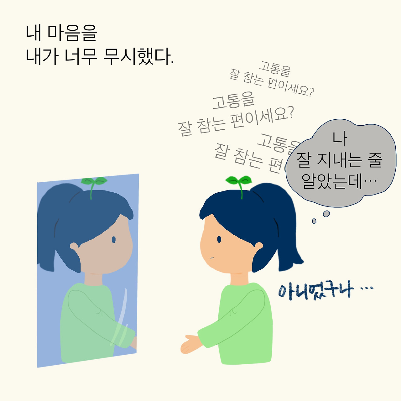 내 감정을 가장 잘 아는 건 자신뿐인데. 내가 내 감정을 꾹꾹 눌러 담고, 모르는 척하는 사이에... 내가 기쁜지, 슬픈지, 괴로운지를 깨닫는 감각마저 무뎌졌다.