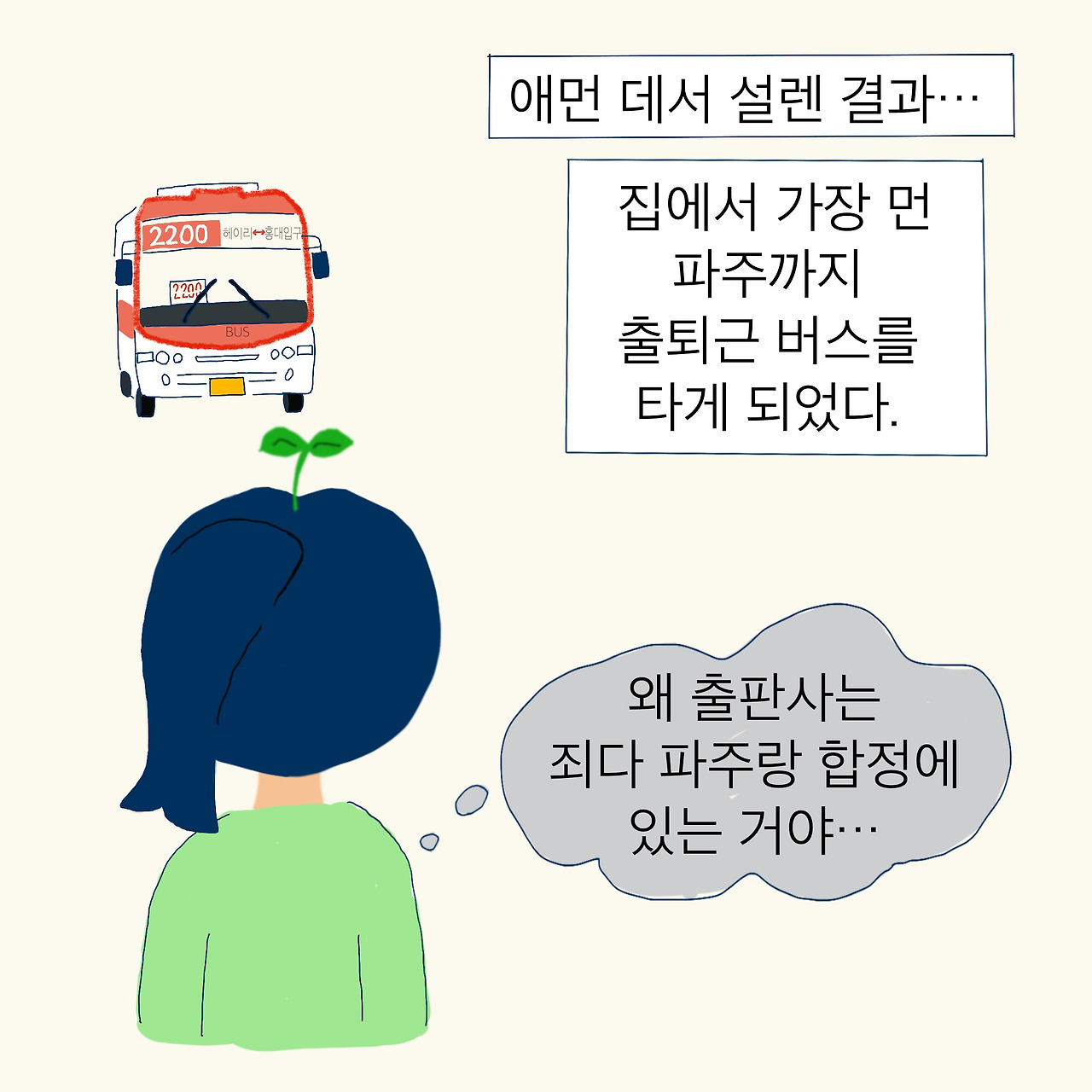 결국 나도 파주에 있는 한 출판사에 취직했다. 집에서 합정까지 지하철로 이동한 후, 합정에서 2200번 버스를 타고 파주로 출근하는 경로였다.