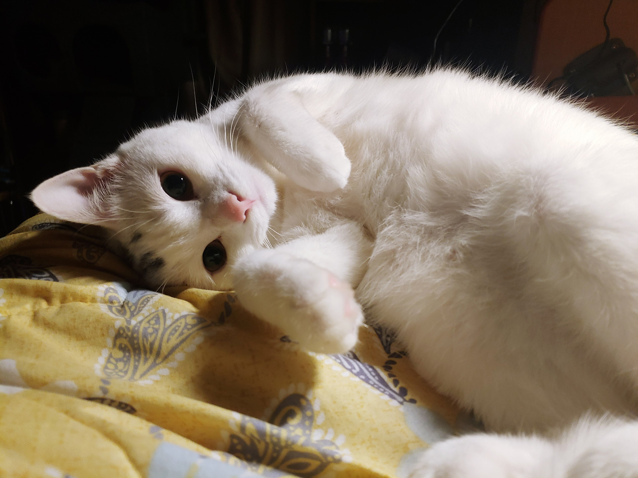 자는 모습이 날마다 어찌나 제각각인지 온몸을 비틀며 자다가 두 손을 교차해서 제 얼굴을 가릴 때도 있는가 하면 머리만 이불 속에 쏙 넣고 잘 때도 있다. 고양이에게 "사람 같다, 연체 동물이다"라고 하는 말에 납득이 간다.