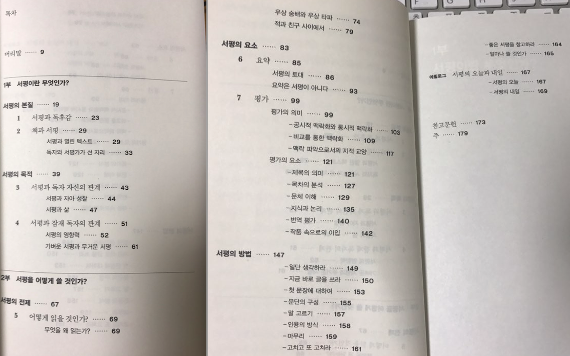 나는 이 정도로 서평이 무엇이고, 왜 써야 하는지에 대한 충분한 답을 얻었다. 후반은 '어떻게'써야 하는지에 대한 내용인데, (여타 'ㅇㅇㅇ글쓰기' 책들에 비하면) 글쓰기 자체에 대한 구체적인 기술을 제시하지는 않는 편이다. 그보다는 어떤 요소들이 포함되는지 어떠한 스타일의 평가가 가능한지에 대한 설명이 들어있다. 그리고 서평을 쓰기 위해 어떤 방법으로 독서를 하면 좋은지와 함께 기본적인 방법들을 알려준다. 어차피 책의 종류가 너무 다양하기 때문에 일률적인 기준을 제시하기는 어려웠을 것이라고 생각한다.