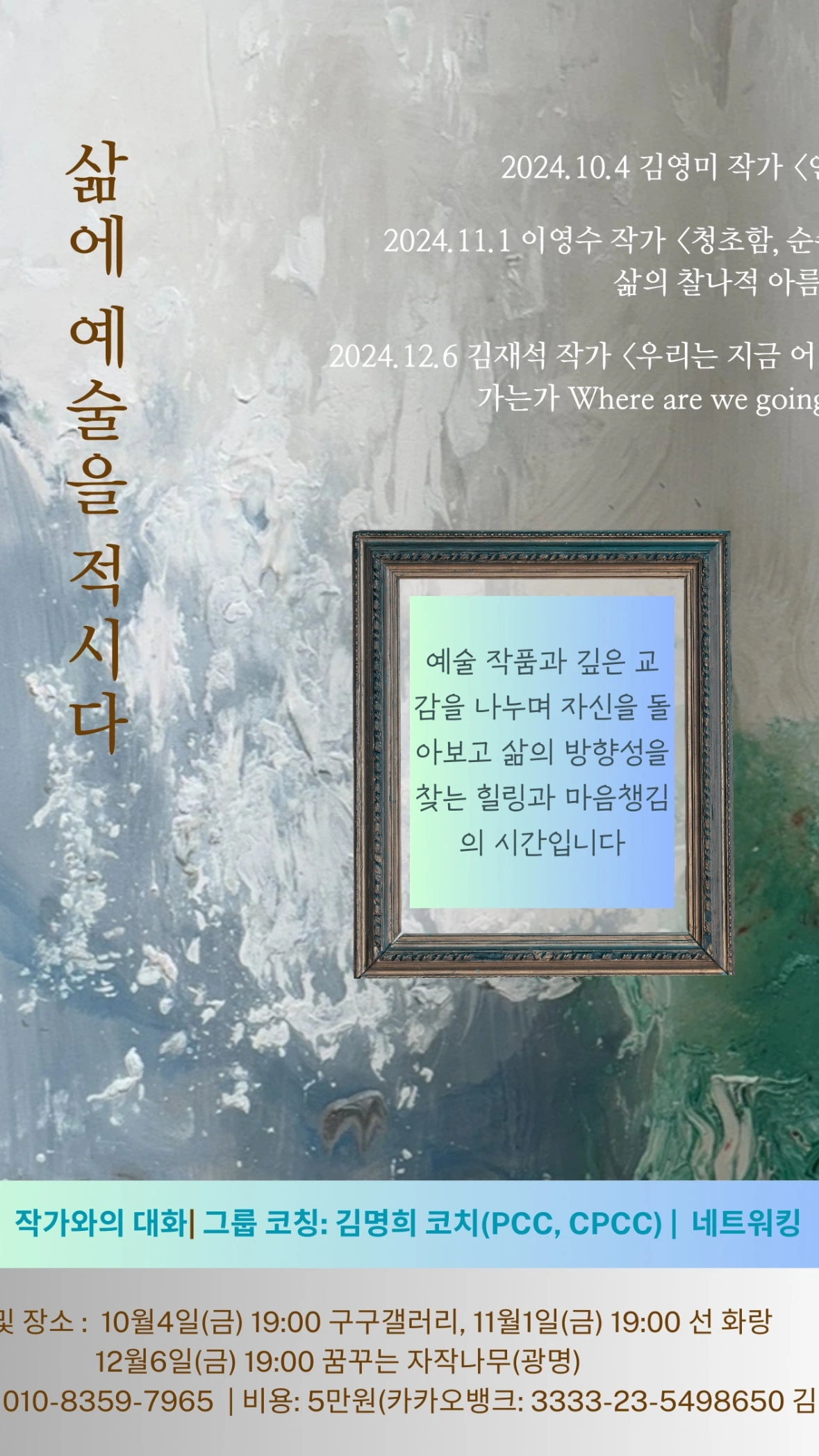 예술이 주는 힘을 극대화 하여 큰 성찰의 시간을 갖고자 그룹코칭 프러그럄을 준비했습니다. 첫 프로그램은 매월 2,4째 금요일에 구구갤러리에서 진행합니다.