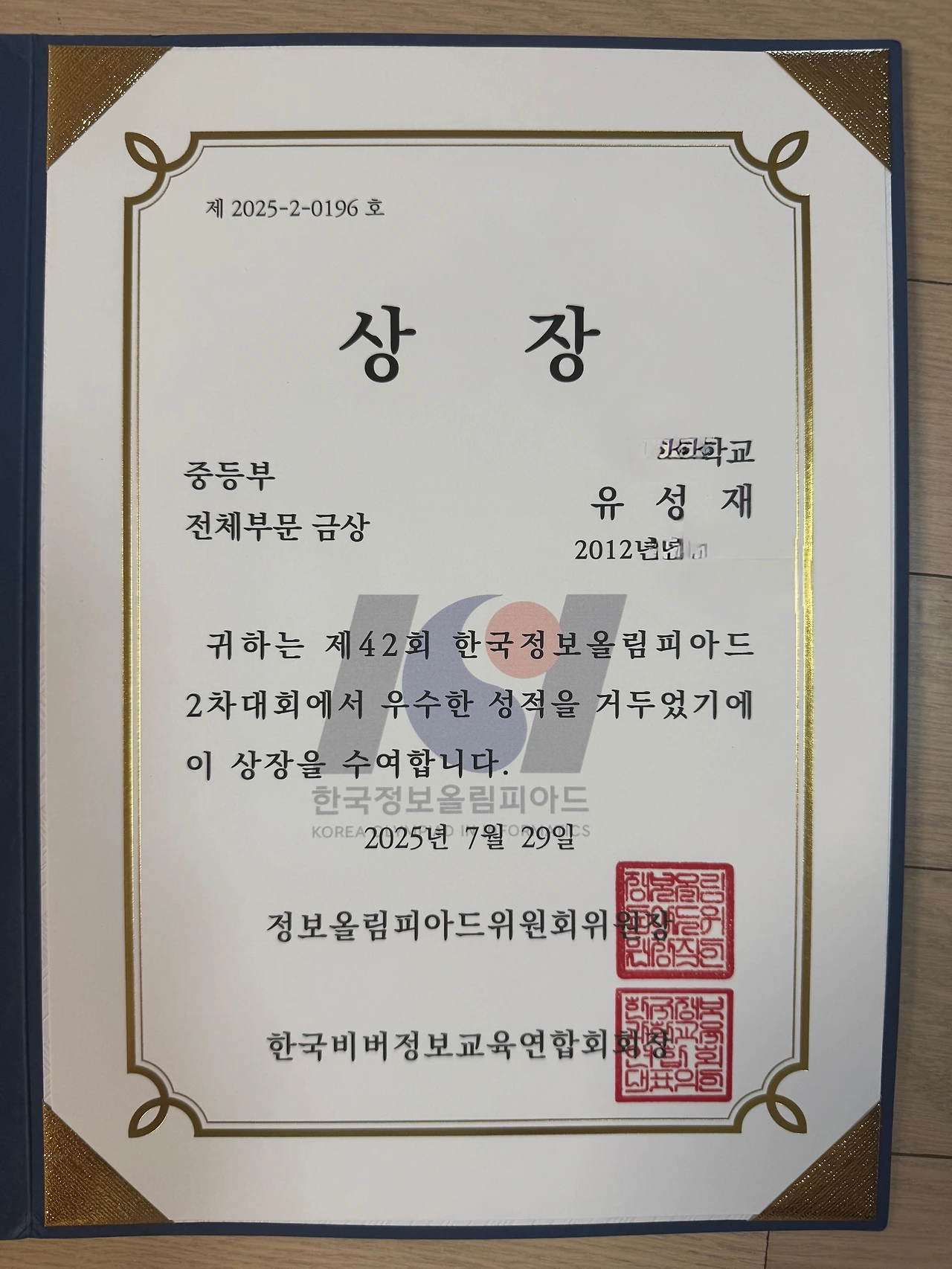이번에 중1 올라가는 둘째 아이가 한국정보올림피아드 본선에서 최종적으로 중등부 금상을 수상했다.