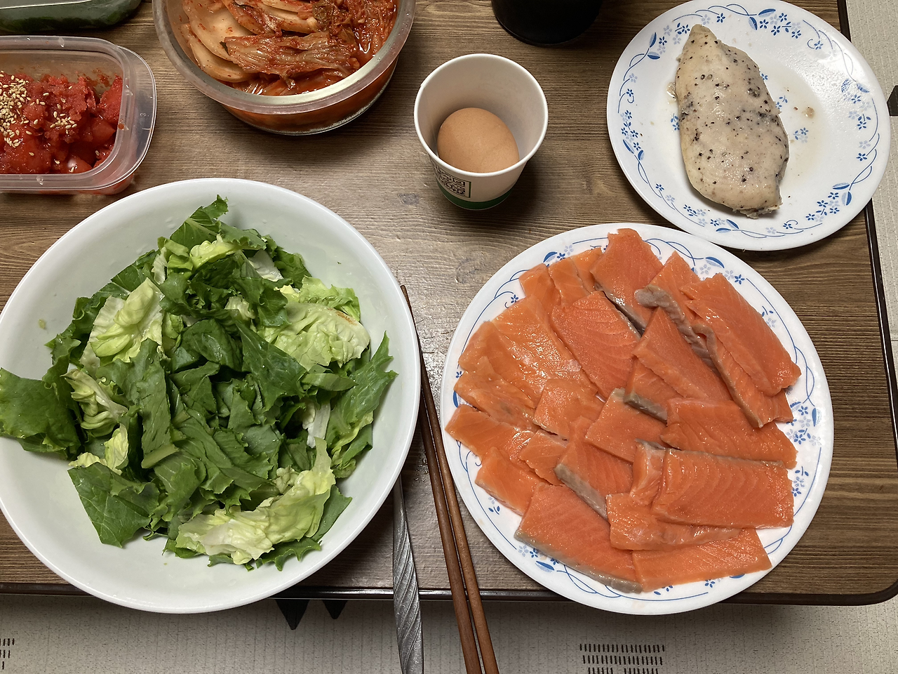 : 이 날도 샐러드를 추가해서 식단을 구성했다. 점심에는 샐러드에 참치캔을 토핑으로 올려 먹었고, 저녁에는 냉동 훈제 연어를 곁들여 먹었다. 단백질을 보충하기 위해 매 끼마다 닭가슴살과 계란을 챙겨 먹었고, 약간의 고기를 함께 먹었다.