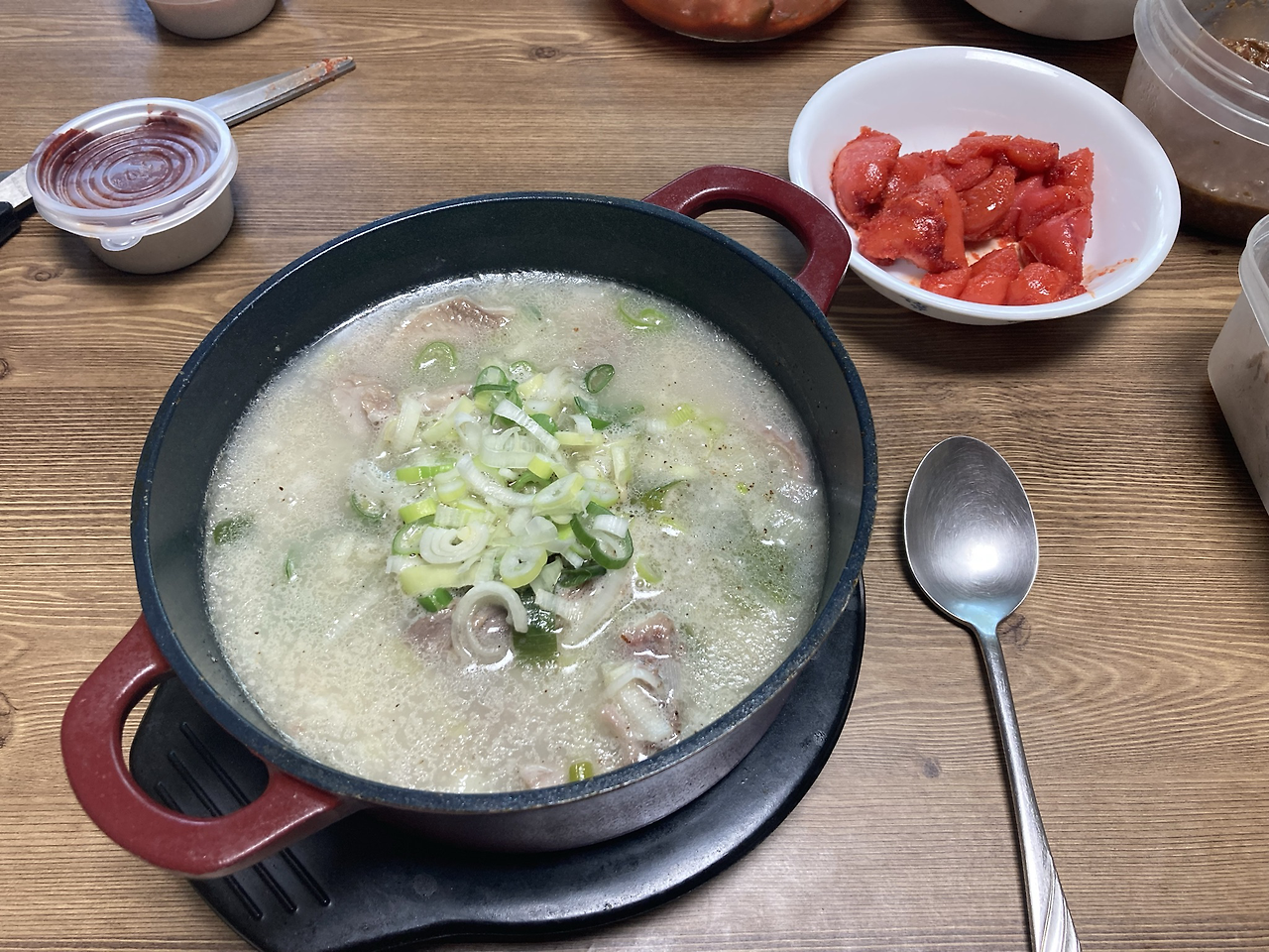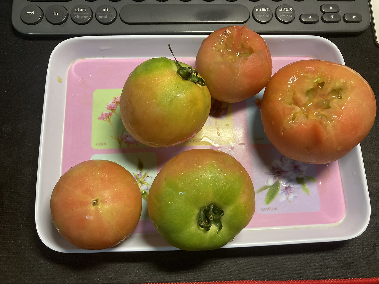 : 이 날은 점심은 원래는 식단을 하려고 준비하고 있었으나, 엄마가 시장에서 돼지국밥을 사다 주셔서 점심은 국밥을 먹었다. 고기도 넉넉하고 국물 맛도 좋아서 아주 맛있게 먹었다. 하지만 그 칼로리를 알기에 양심상 저녁은 먹을 수가 없었다. 그래서 저녁은 먹지 않았다. 그런데 밤늦게 다른 일을 하다 너무 배가 고프길래, 그나마 살이 좀 덜 찐다는 토마토를 먹었다. 배가 고팠던지라 토마토가 아주 달게 느껴졌다.