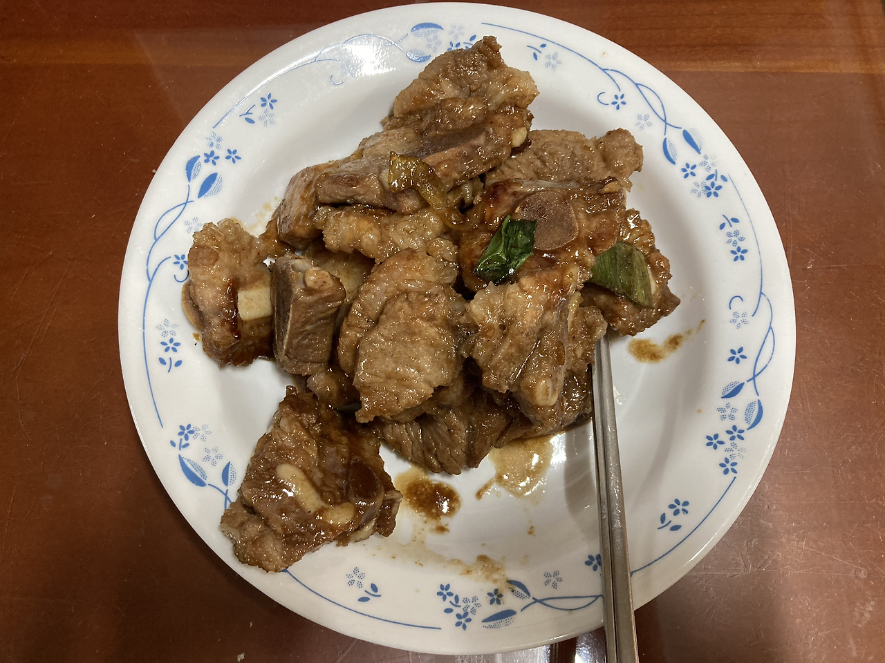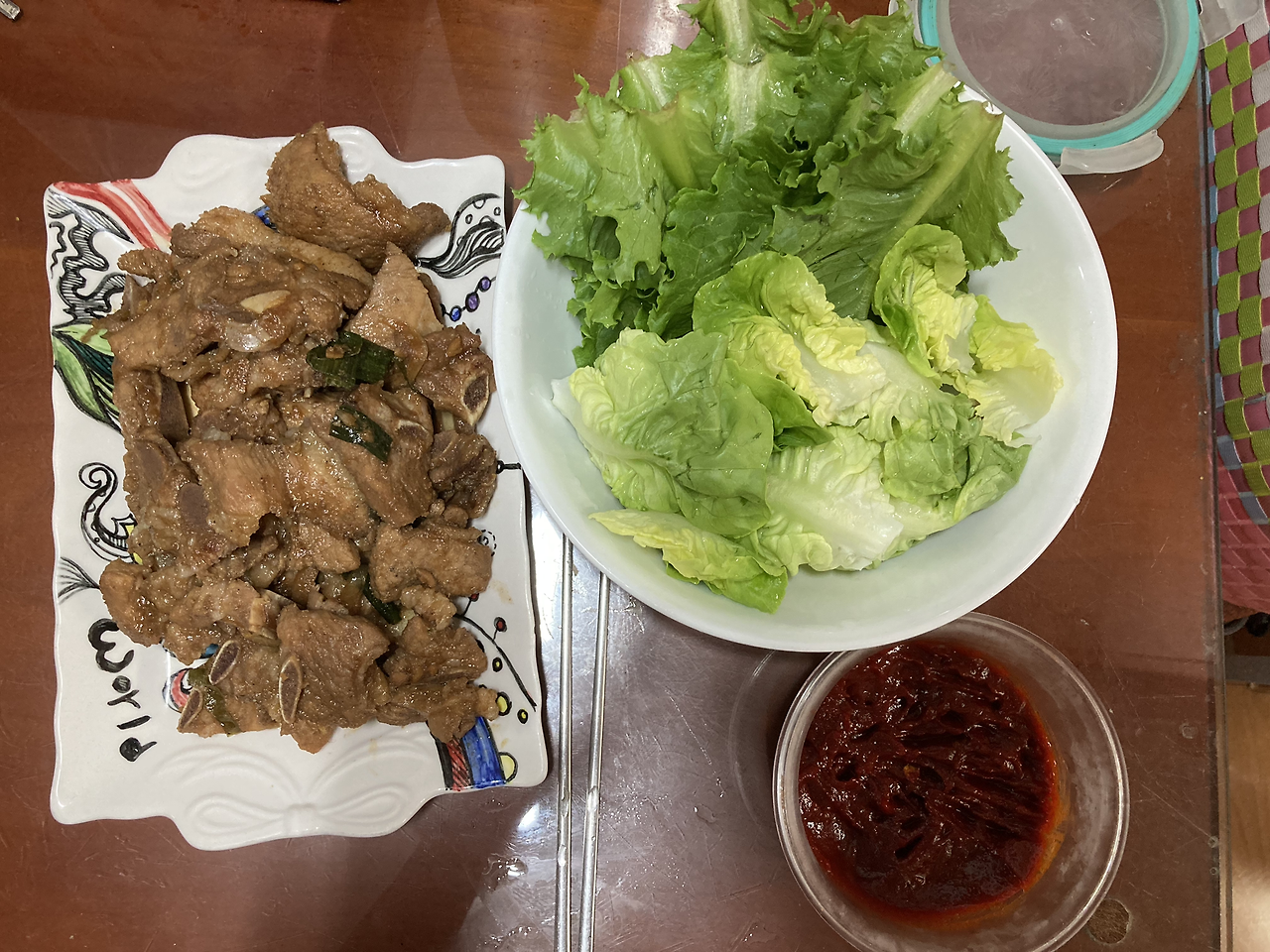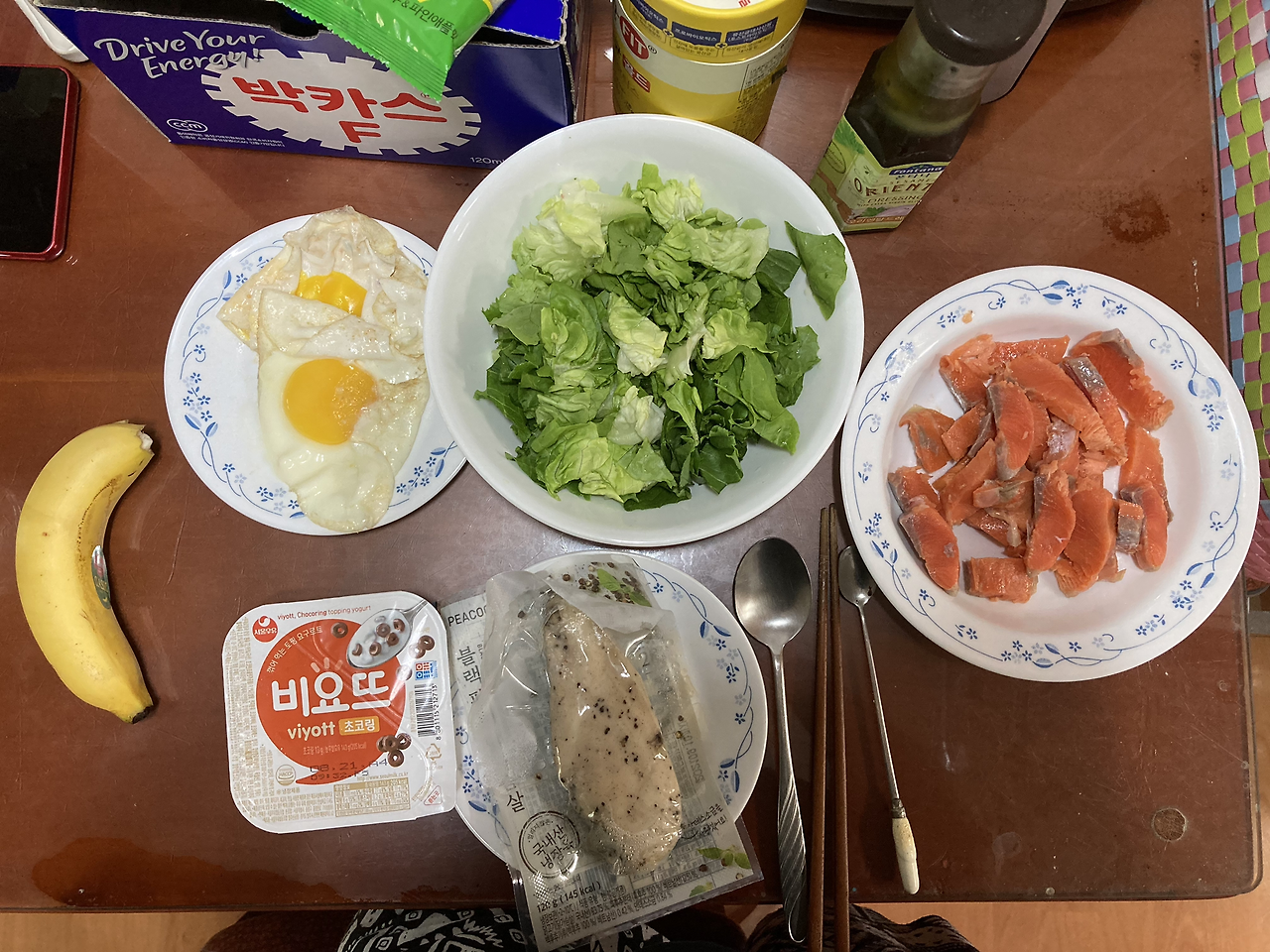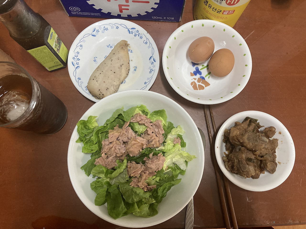 : 이 날부터 샐러드를 식단에 추가해봤다. 샐러드를 좋아하지 않아서 그동안 닭가슴살과 단백질만 챙겨 먹었는데, ‘좀 더 건강하게 살을 빼고 싶다’는 생각이 들어 야채를 먹기 시작했다. 처음부터 이질적인 야채 위주로 먹으면 금방 포기할 것 같아서, 상추와 작은 양상추(?)를 섞어서 먹었다. 드레싱은 찾아보니 오리엔탈 드레싱이 열량이 낮다고 하여, 그걸로 뿌려 먹었다. 다행히 집에 얼려둔 훈제 연어가 있어 샐러드와 함께 먹으니, 꽤 먹을 만했다. 저녁에는 양념갈비와 쌈으로만 구성하여 먹었다. 저 고기 양을 다 먹지는 못했고, 반은 남겼다.