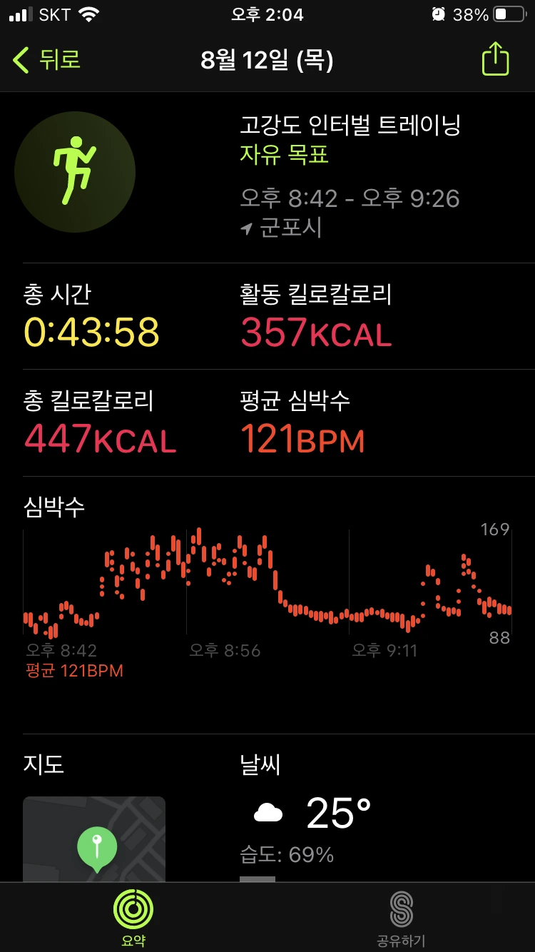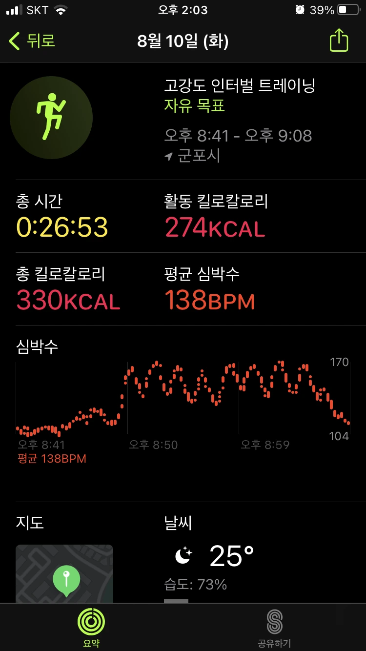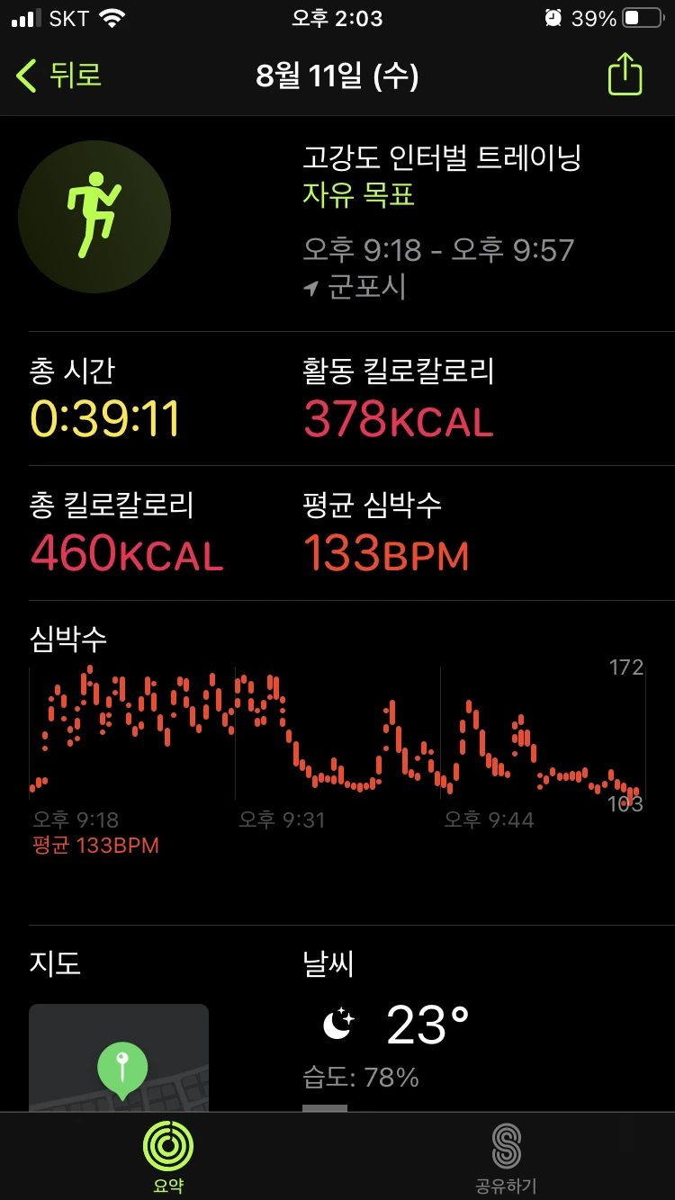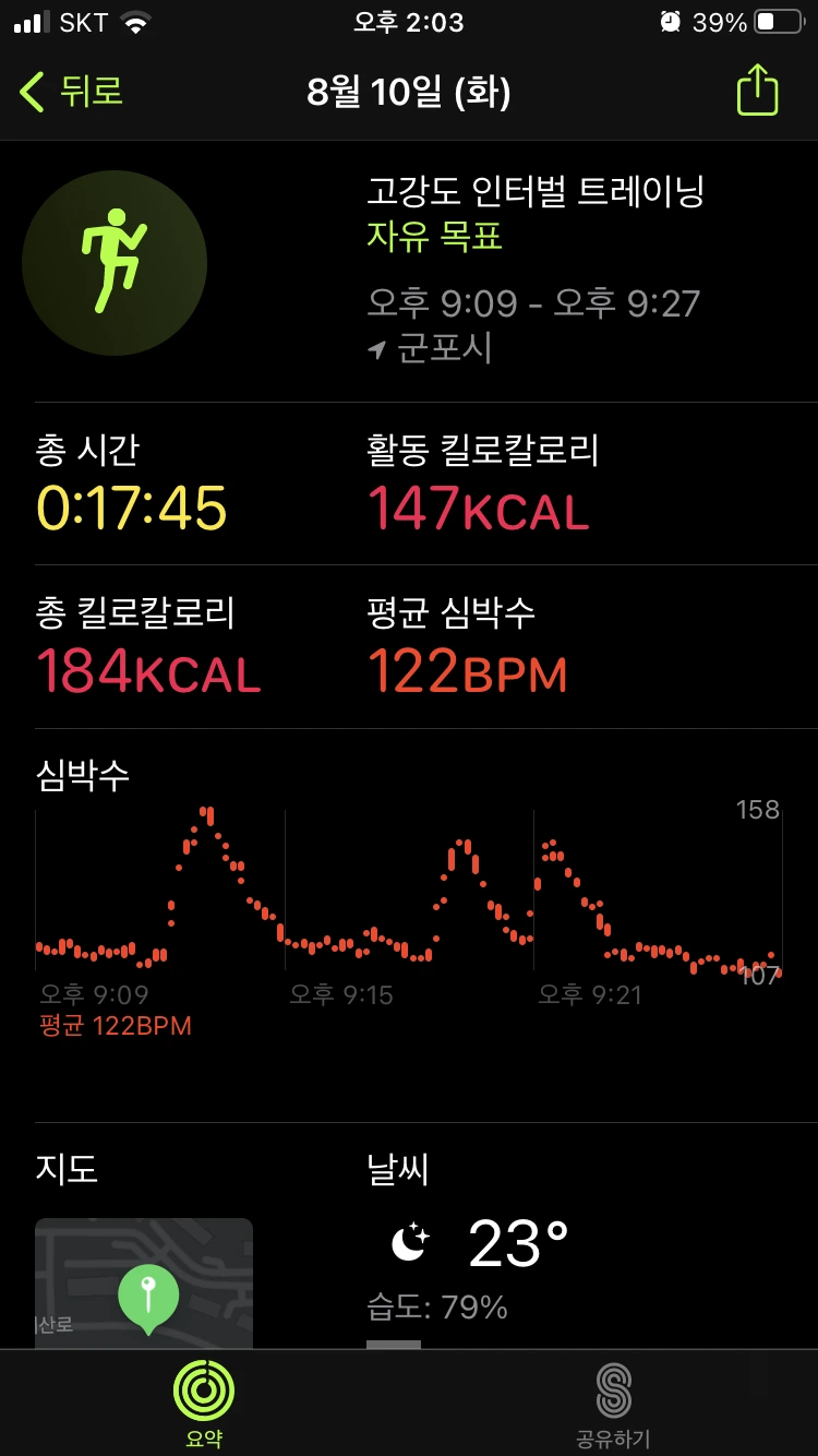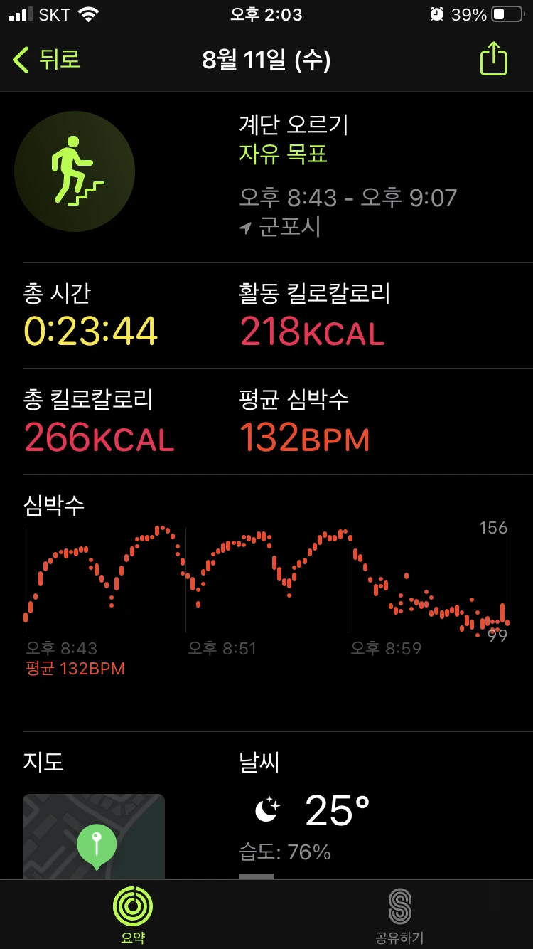 : 이 날은 조금 꾀가 나서 계단 운동을 1번만 했다. 러닝은 서서히 적응이 되는데, 아직도 계단은 오를 때마다 힘들다. 이 날은 유독 더 계단 오르기가 힘들게 느껴져, 한 번만 오르고 오전 운동을 마무리했다. 그리고 저녁에도 계단 운동은 빼고 인터벌 러닝만 진행했다. 피트니스 링을 다 채우지 못해서 아쉽지만, 그래도 빠지지 않고 운동한 것에 의의를 뒀다.