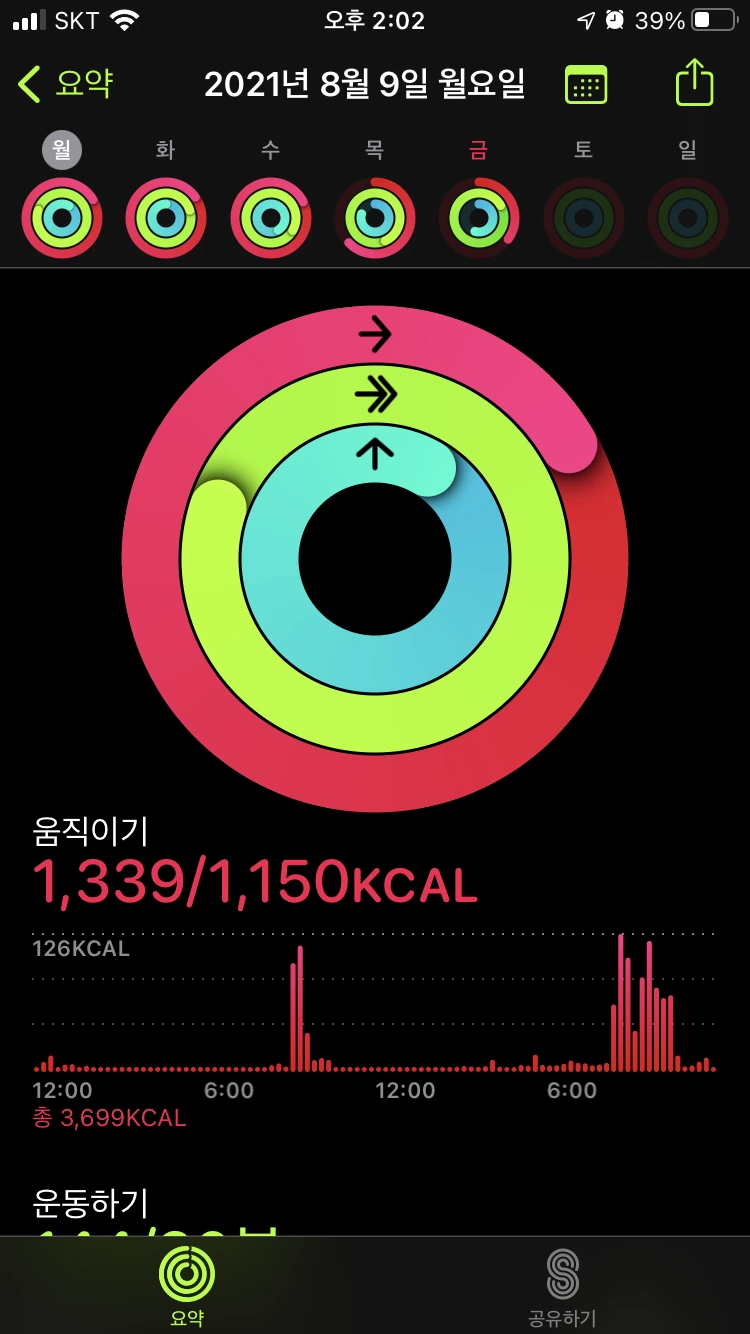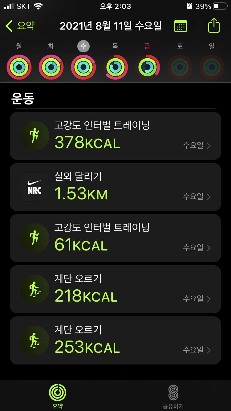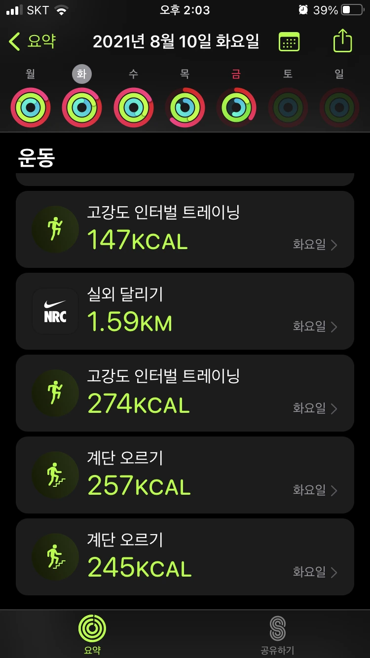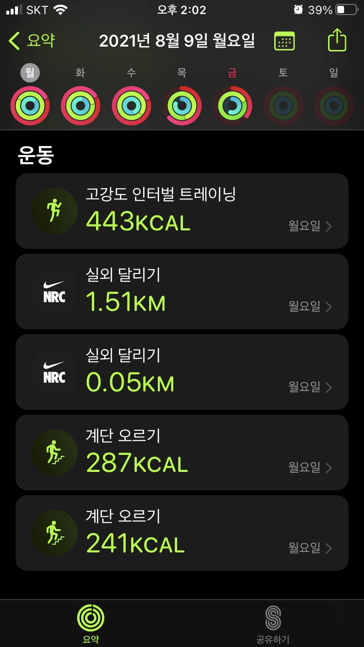 : 똑같이 계단 운동 2번과 인터벌 러닝을 진행했다. 전날은 약간의 근육 당김이 있었는데, 이날은 몸이 조금 적응을 했는지 러닝 할 때 다른 날보다 조금 수월한 기분이었다. 같은 운동의 반복으로, 이 날 역시 피트니스 링을 다 채울 수 있었다.