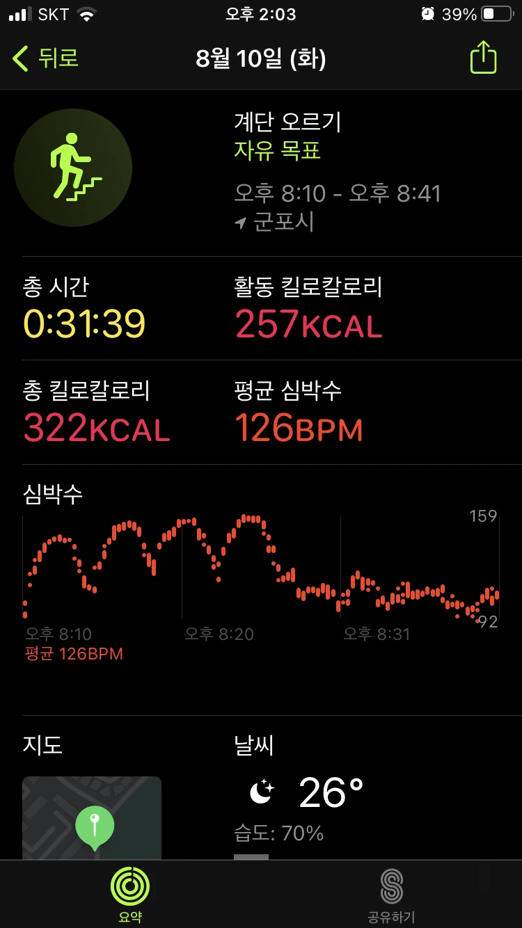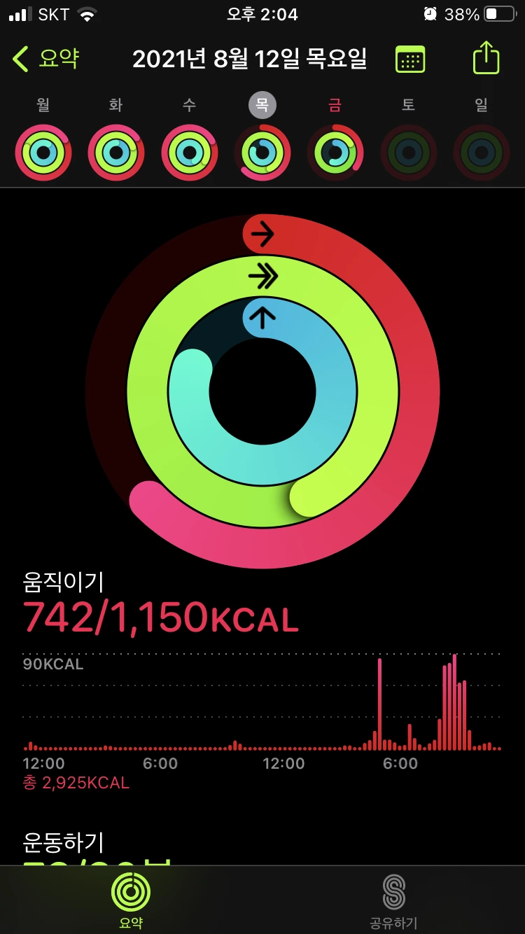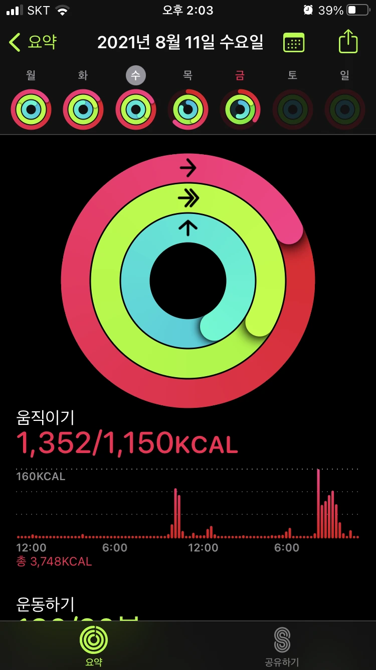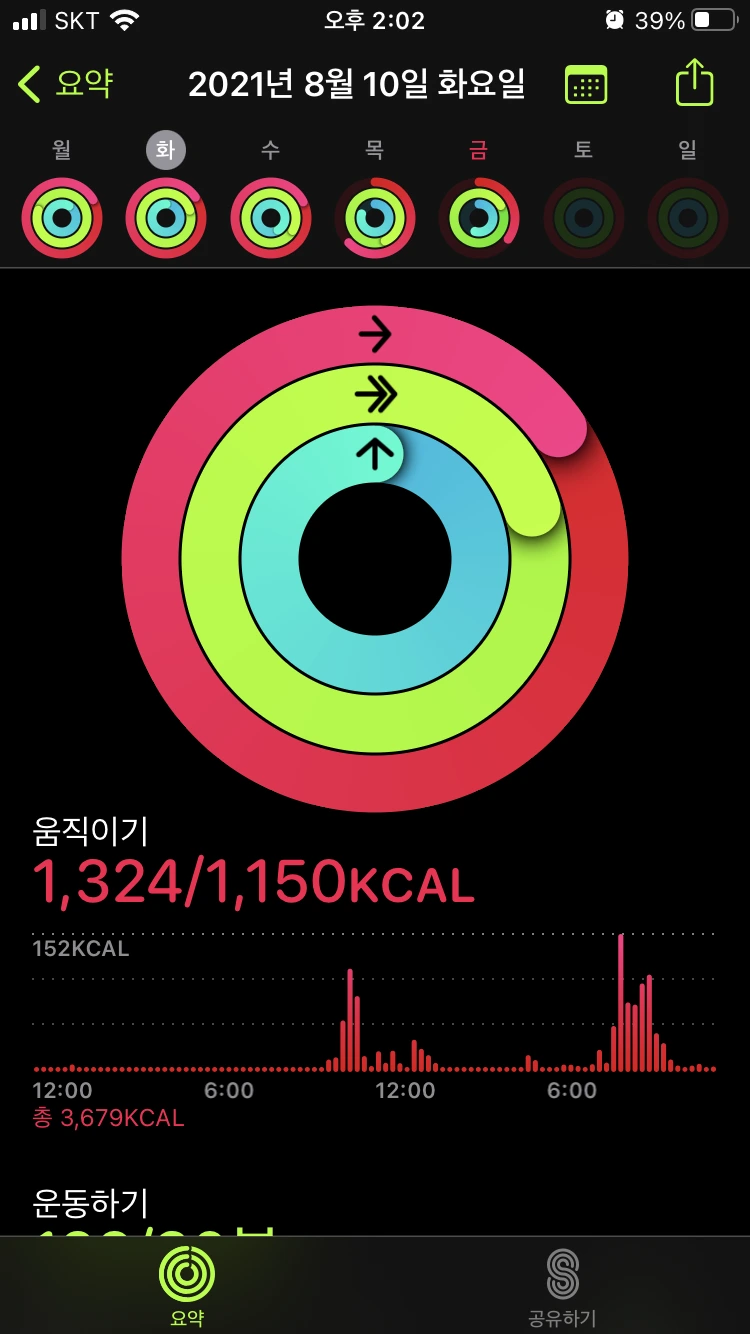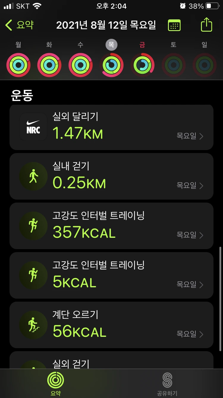 : 똑같이 계단 운동 2번과 인터벌 러닝을 진행했다. 전날은 약간의 근육 당김이 있었는데, 이날은 몸이 조금 적응을 했는지 러닝 할 때 다른 날보다 조금 수월한 기분이었다. 같은 운동의 반복으로, 이 날 역시 피트니스 링을 다 채울 수 있었다.
