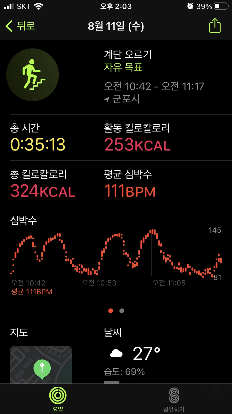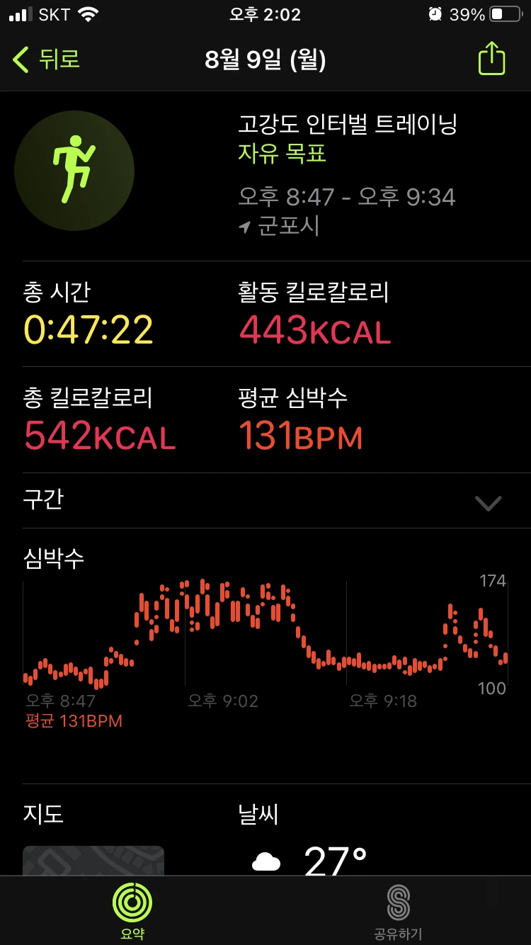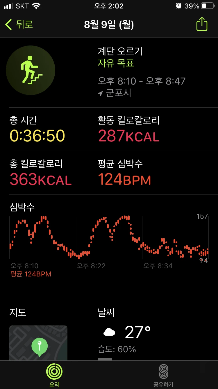 : 이 날도 마찬가지로 계단 운동 (15층 X 4회) 2번과 인터벌 러닝을 진행했다. 또한 이 날 역시 저녁 운동 때 엄청난 양의 땀이 쏟아져 나왔다. 아무래도 계단 운동과 러닝을 병행했을 때, 시너지가 발생하는 것 같다. 어제 오랜만에 피트니스 링을 다 채워서인지 이날은 조금 몸이 무거웠다. 그렇다고 몸을 몸 움직일 정도로 불편했던 건 아니고, 기분 좋은 근육 당김 정도가 있었다. 그리고 이 날 또한 피트니스 링을 다 채웠다.